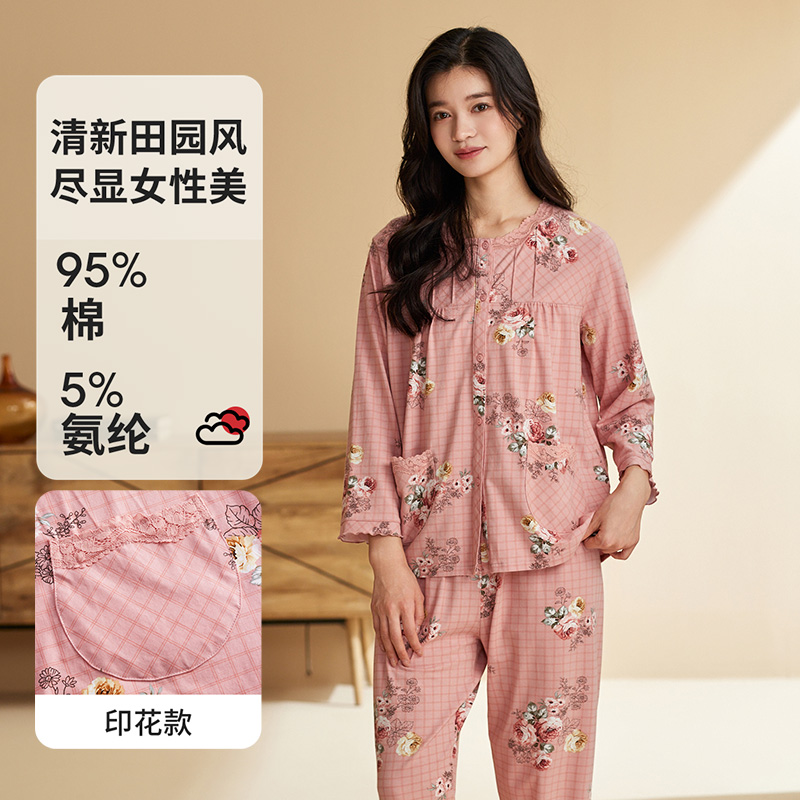 家居服套装 秋鹿 蕾丝花边印花格子长袖 纯棉睡衣女士秋季 超柔软