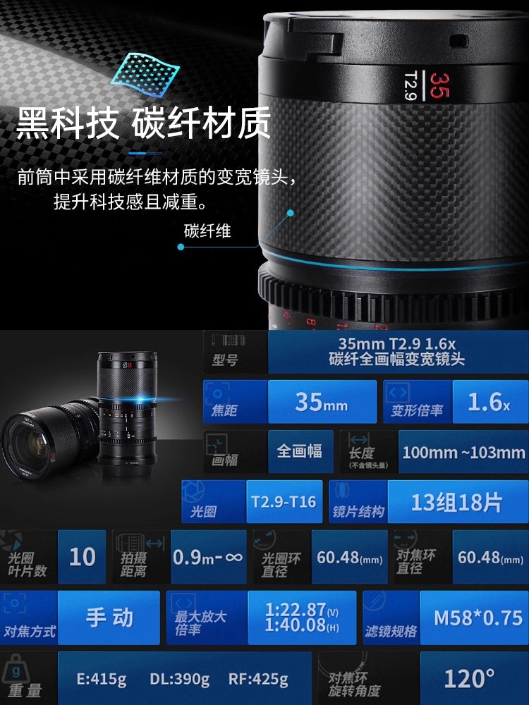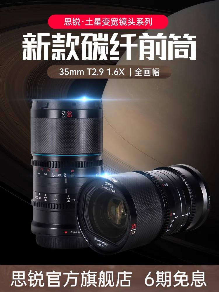 思锐35mm T2.9土星系列碳纤维1.6X变宽电影镜头适用索尼佳能R大疆