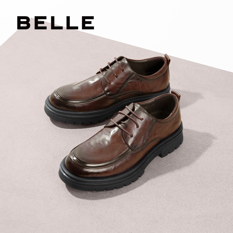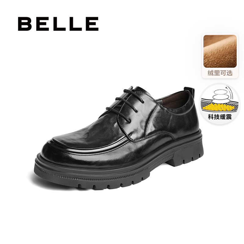 百丽男鞋 加绒A1906AM5 厚底商务休闲男25新真牛皮抓纹通勤德比婚鞋