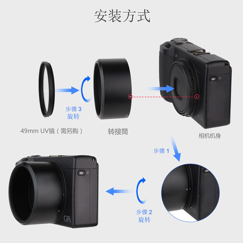 相机49mmUV镜转接环转接广角镜头GW 号歌理光GR3 1GA HDF 2增距镜长焦镜替代GA 2转接筒滤镜配件 GR3X