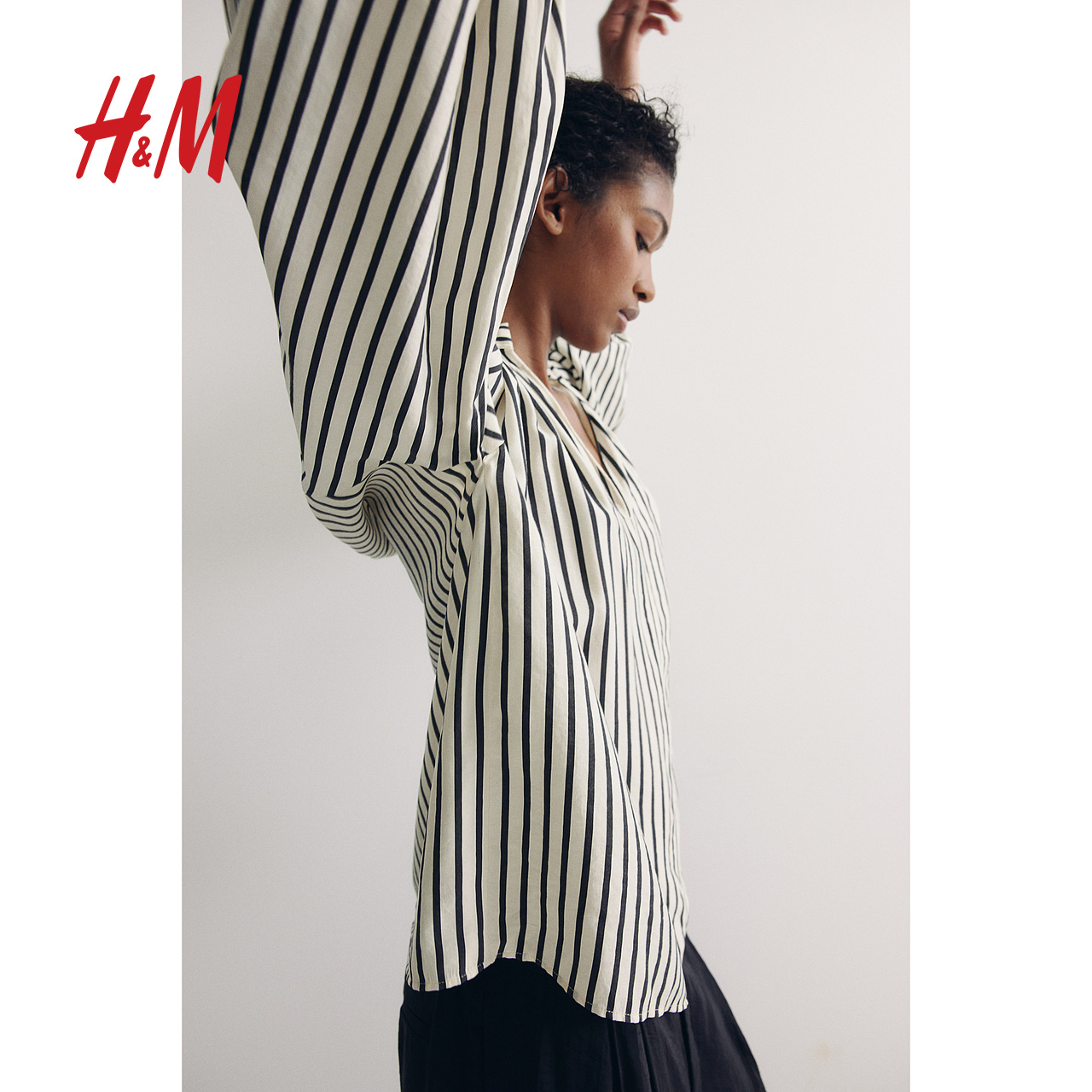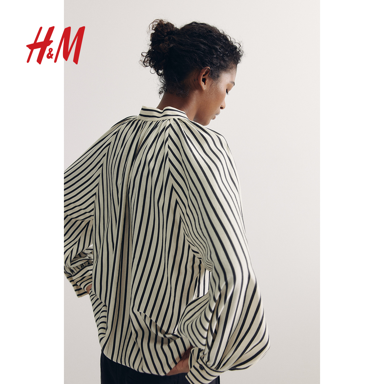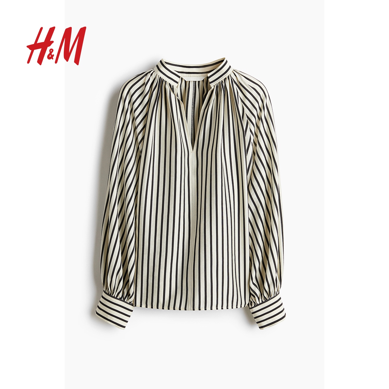 衬衫 气质长袖 秋季 大廓形法式 上衣1258814 条纹V领灯笼袖 HM女装