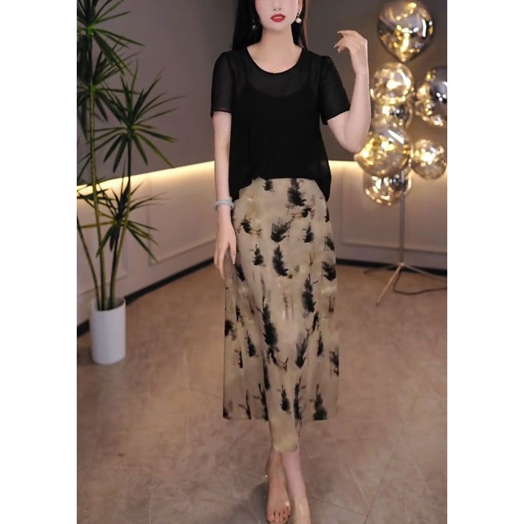 T恤裙夏日女装 拼接格子裙女短袖 长裙2025新款 唐狮连衣裙女夏季