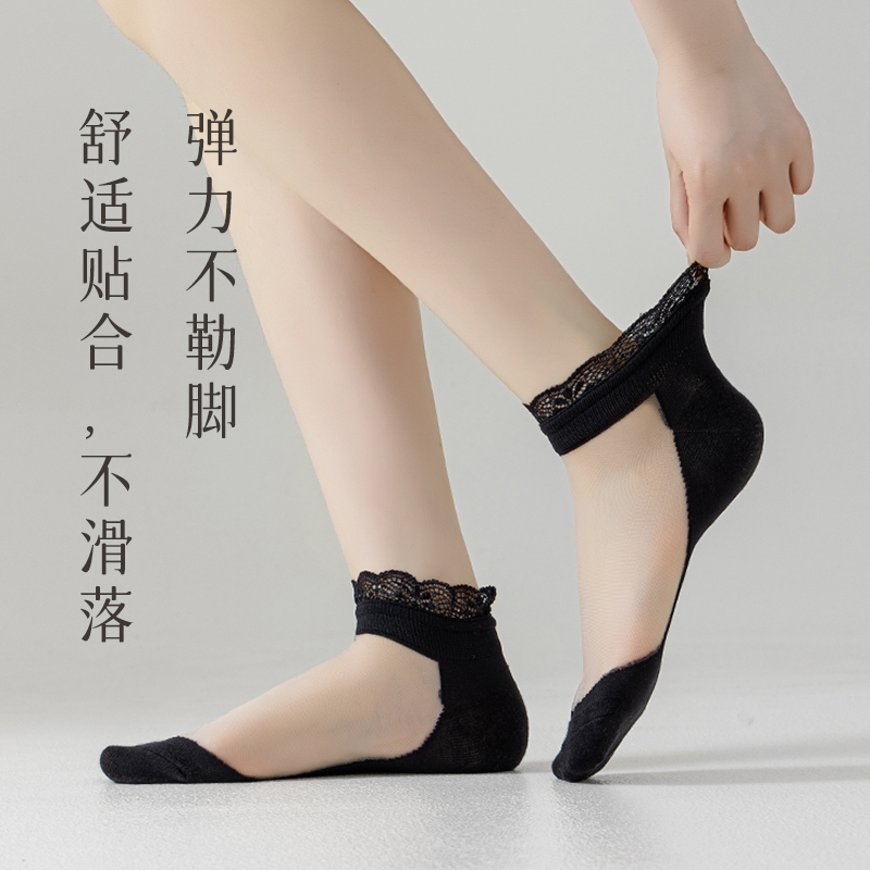 7A抗菌防臭花边丝袜女夏季 透明水晶玻璃丝袜蕾丝边可爱短袜 薄款