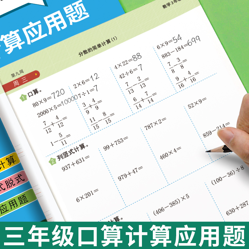 应用题三合一练习本 脱式 三年级上下册数学计算题强化训练口算天天练人教版 口算题卡每日一练小学3年级口算竖式