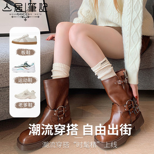 棕咖色月子长袜 乐福鞋 木耳边堆堆袜子女秋冬季 纯棉中筒袜配小皮鞋