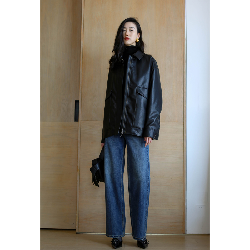显瘦单排扣长袖 百搭宽松休闲皮衣外套韩版 上衣女口袋 新款 春秋季
