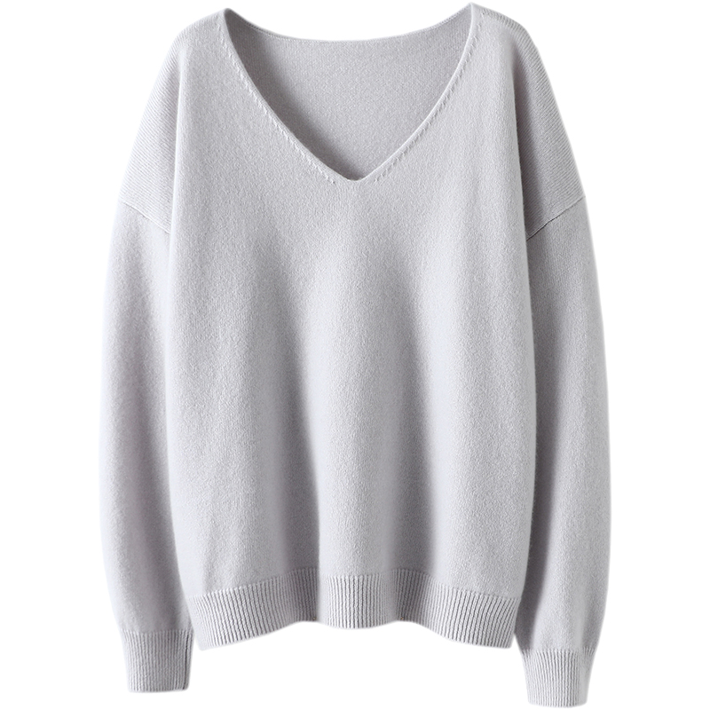 圆领100%纯山羊绒衫 灰色宽松打底上衣 女毛衣秋冬假两件拼色针织衫