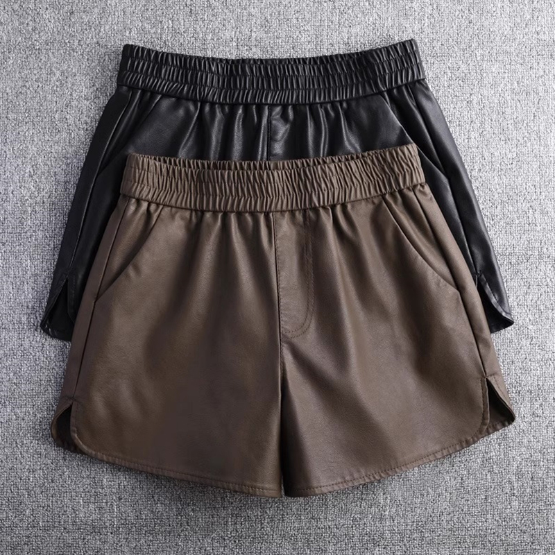 胖m梨型身材遮胯显瘦阔腿A字打底靴裤 黑色高腰PU皮短裤 女秋冬大码