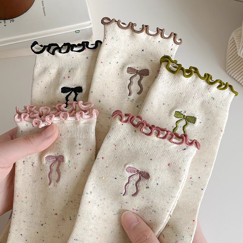 起多规格 4双装 女士秋季 花边堆堆长袜袜子女中筒袜蝴蝶结棉袜