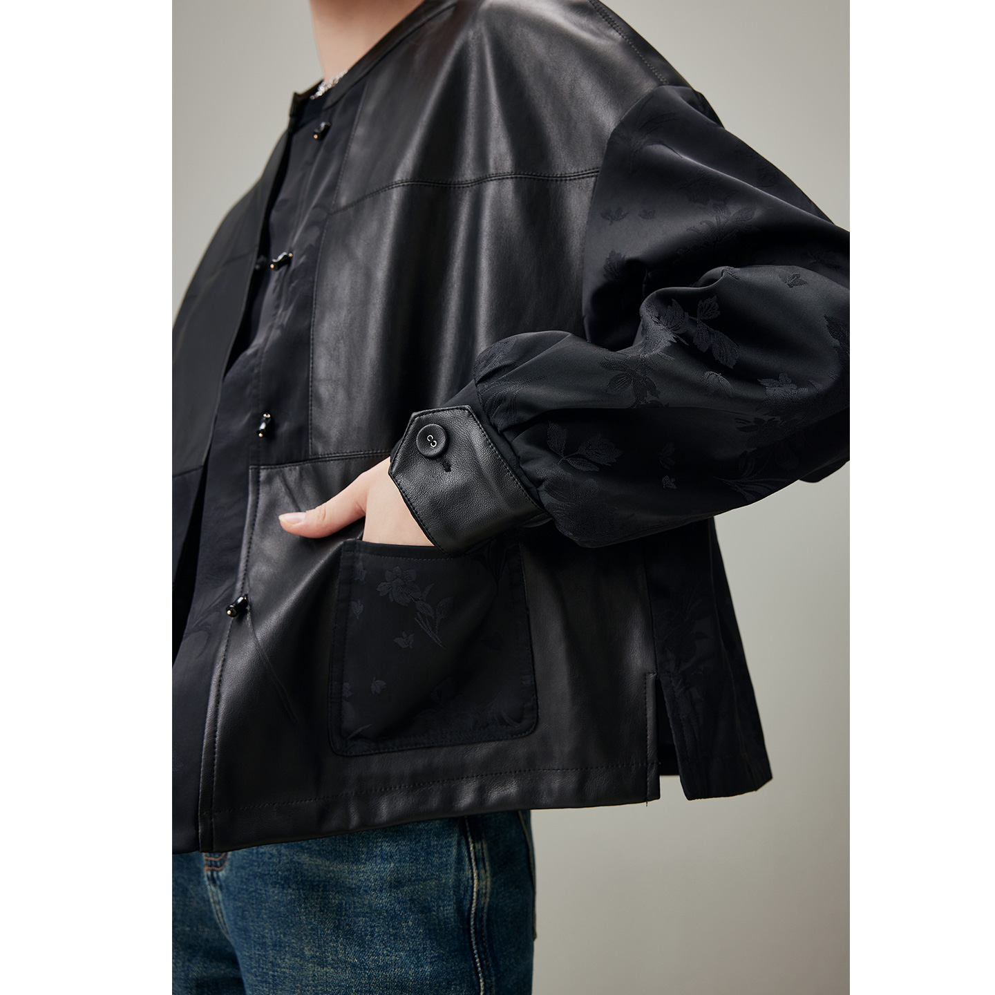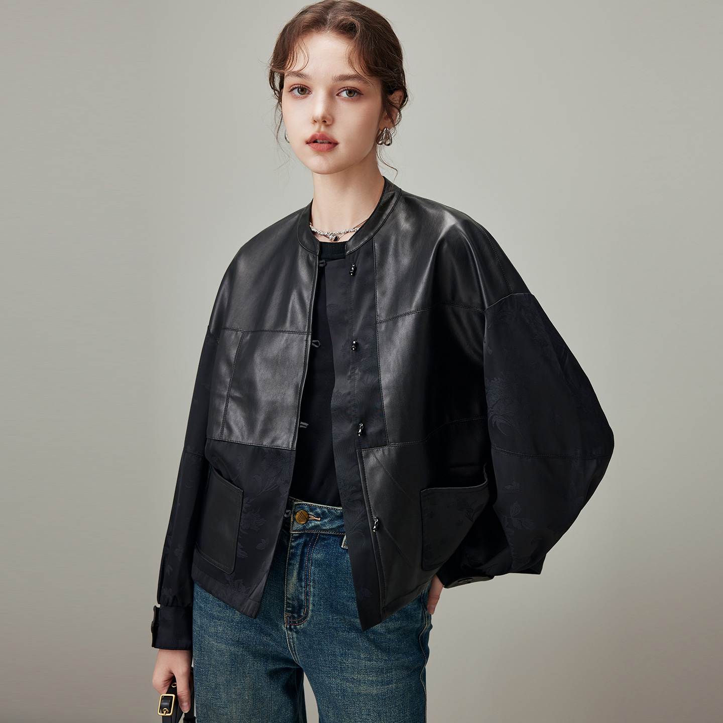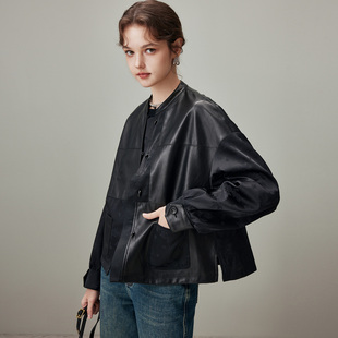 提花拼接宽松夹克 新款 dfvc黑色复古国风短款 皮衣外套女2025年秋季