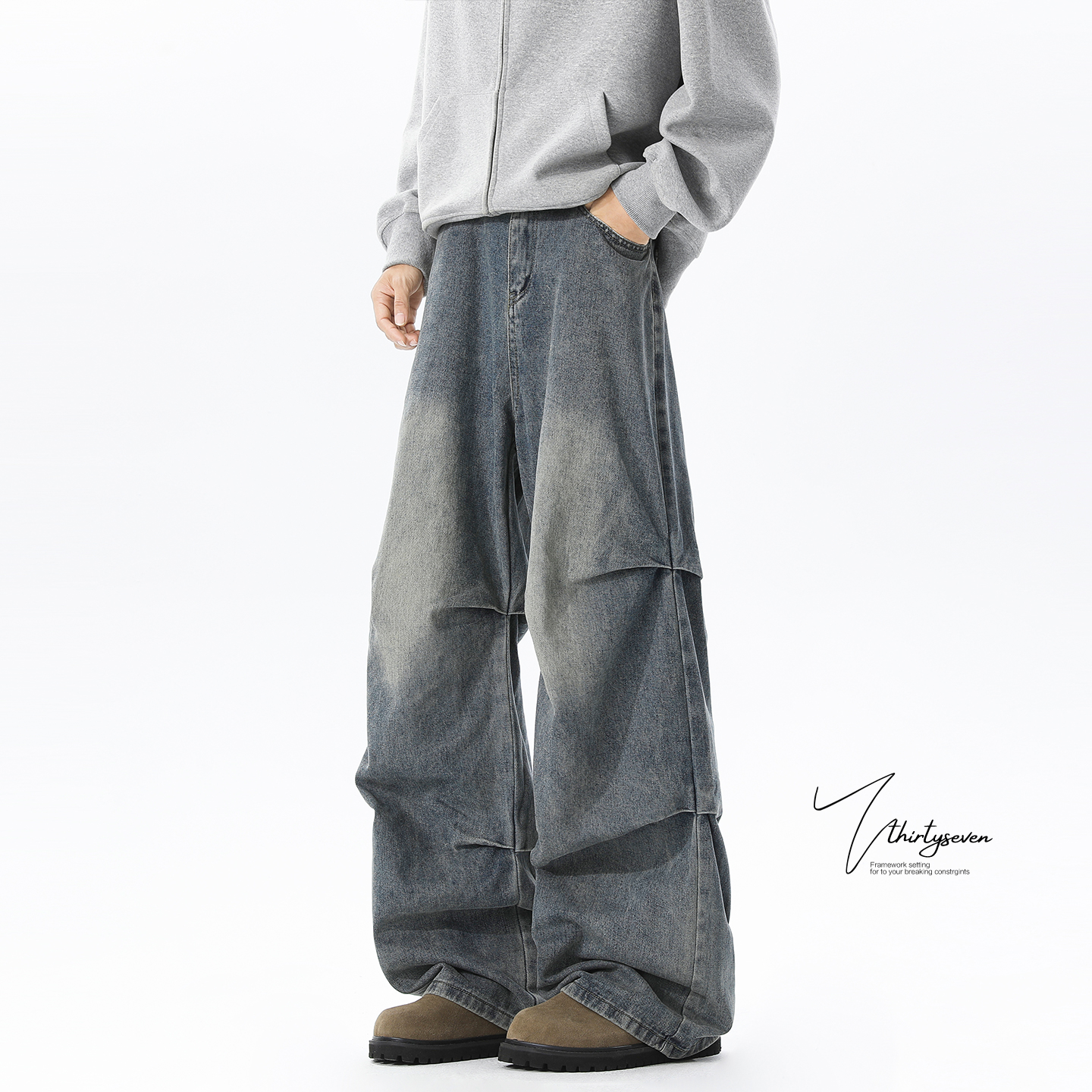 高街解构阔腿裤 V37美式 潮牌宽松直筒裤 男秋季 复古褶皱弯刀牛仔裤