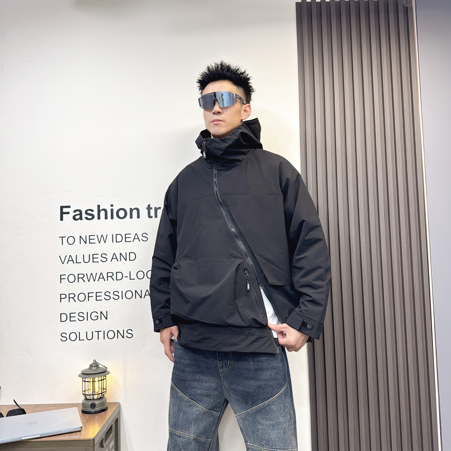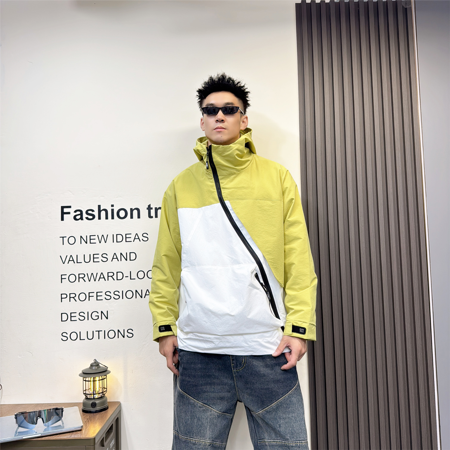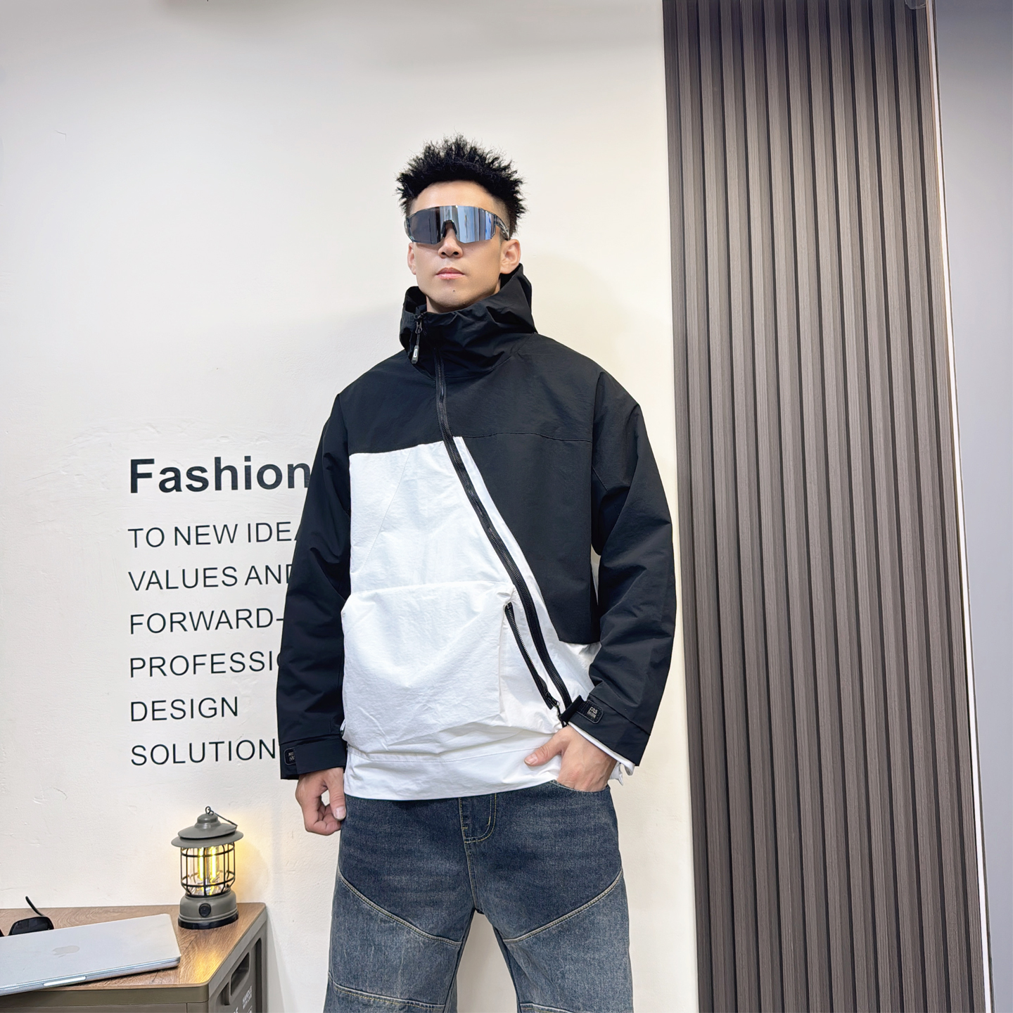 2025早秋新款 拼接斜拉链夹克潮流痞帅宽松上衣 拼色连帽外套情侣款