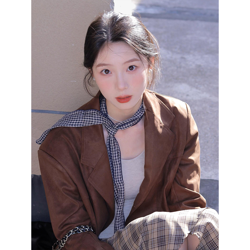 复古文艺格纹亚麻丝巾秋冬薄款 搭配颈带丝带飘带韩系百搭配饰颈饰
