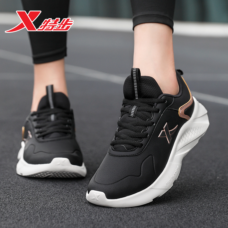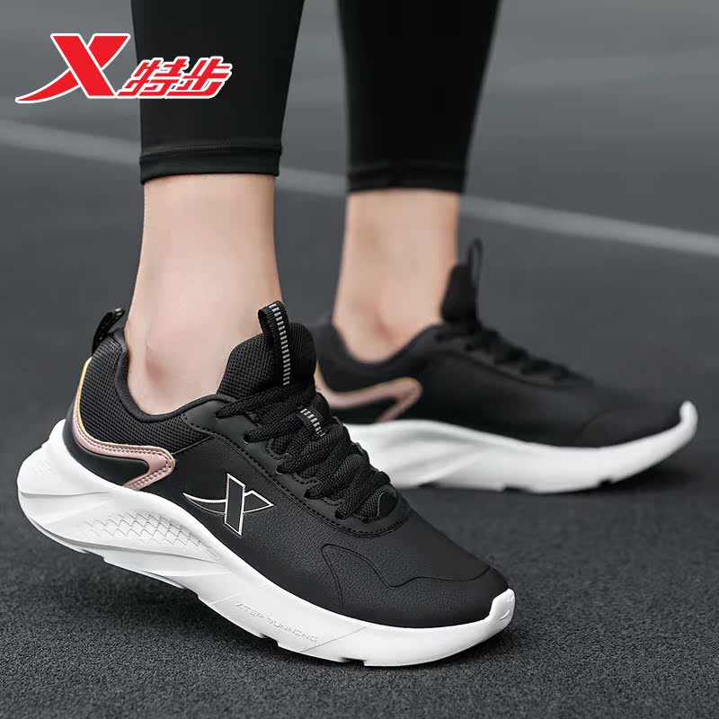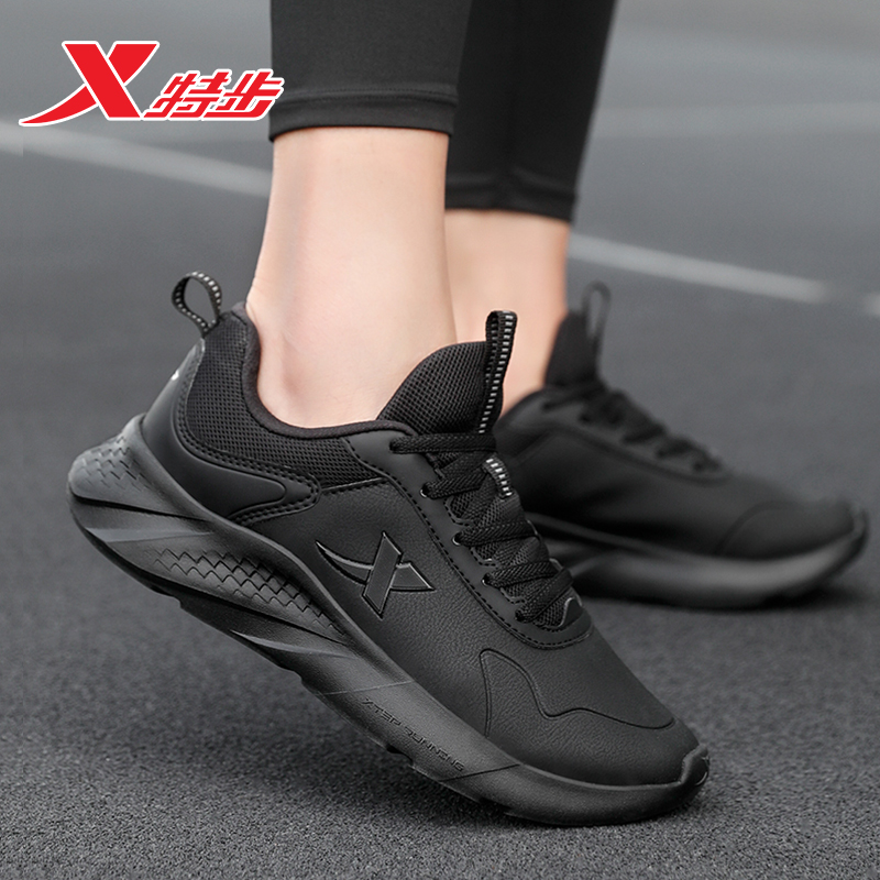 2025新款 皮面运动鞋 软底防水跑步休闲鞋 黑色秋季 子男正品 特步男鞋