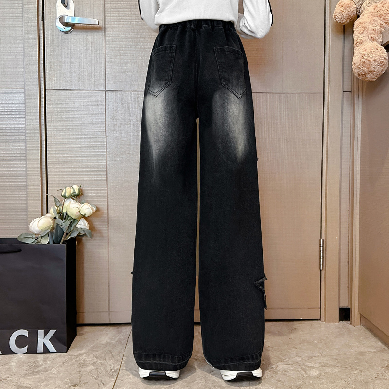 儿童裤 女童阔腿裤 时髦洋气黑色秋装 秋款 子 春秋大童宽松直筒牛仔裤