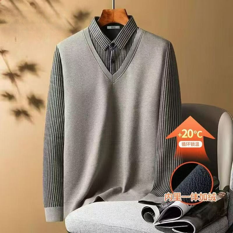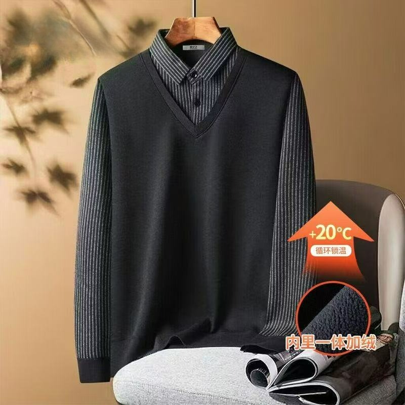 一体绒中老年爸爸装 衬衫 假两件针织衫 新款 领毛衣男加绒加厚秋冬季