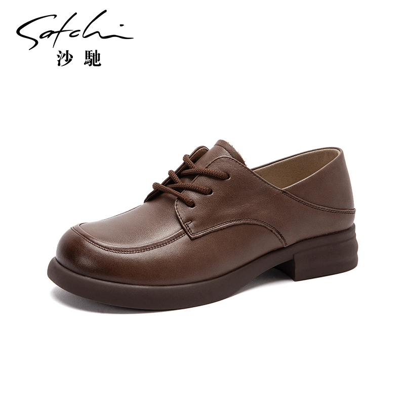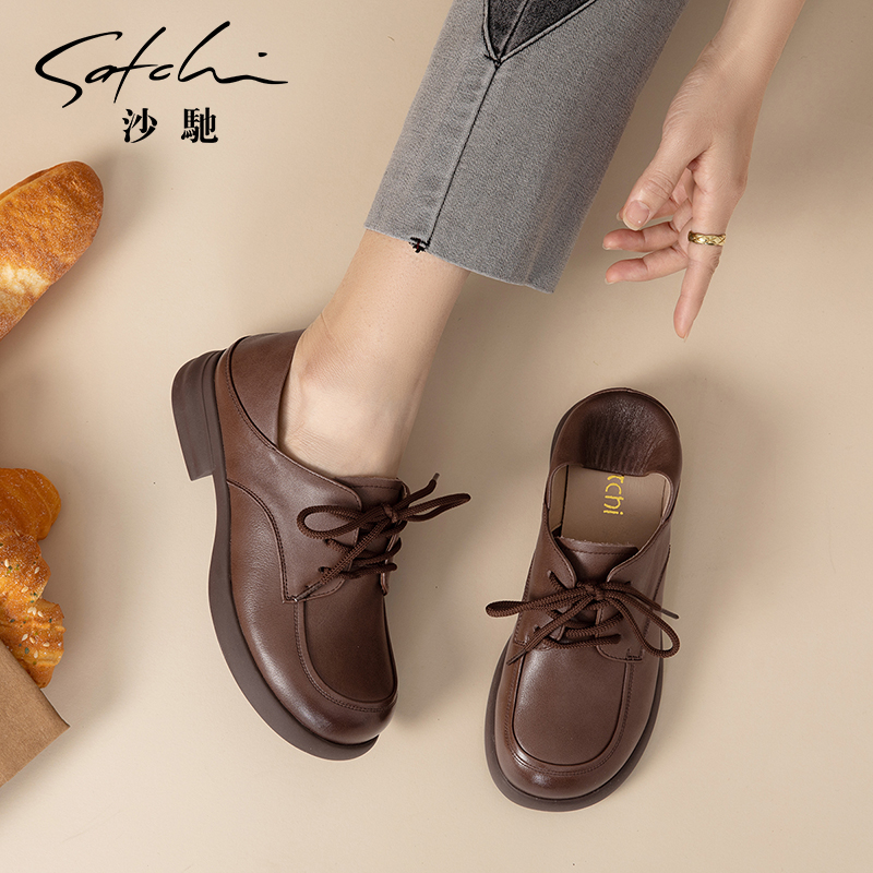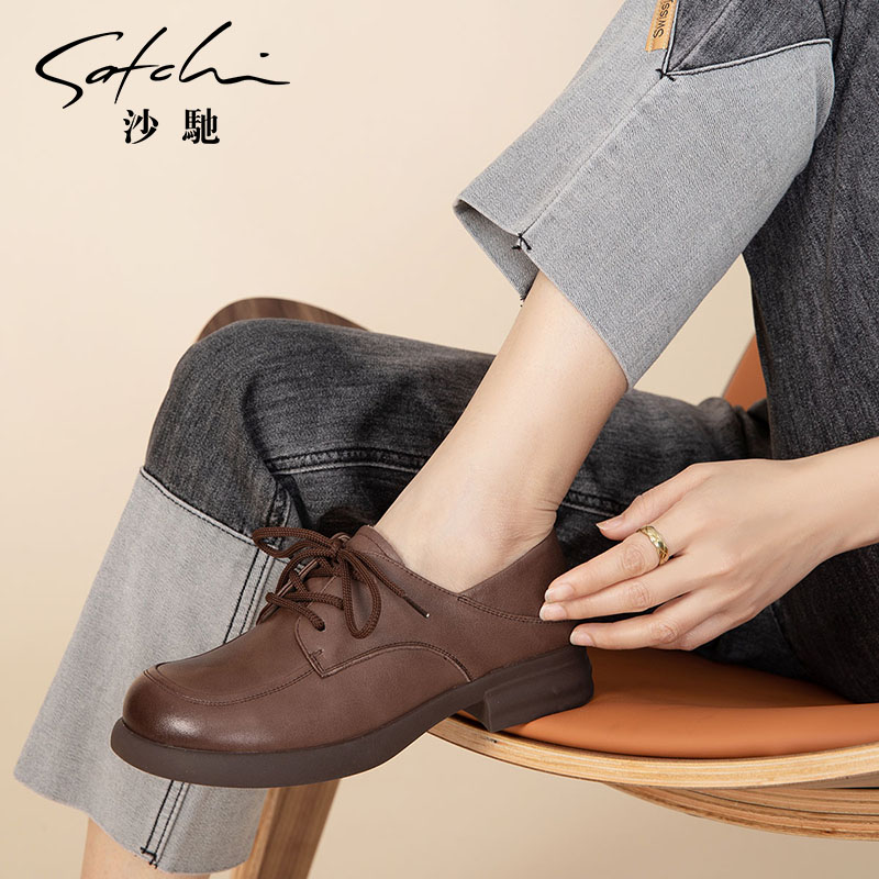 通勤单鞋 沙驰女鞋 舒适低跟可踩跟乐福鞋 百搭系带小皮鞋 25年新款