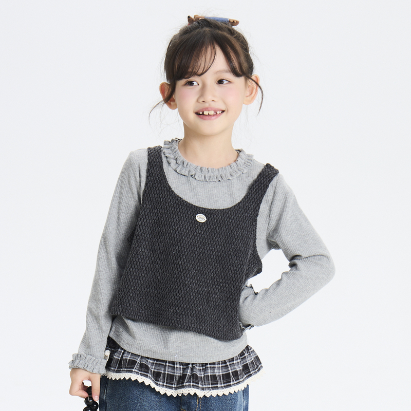 新款 打底衫 不规则下摆无袖 蕾丝黑色长袖 两件套 针织马甲套装 秋冬季