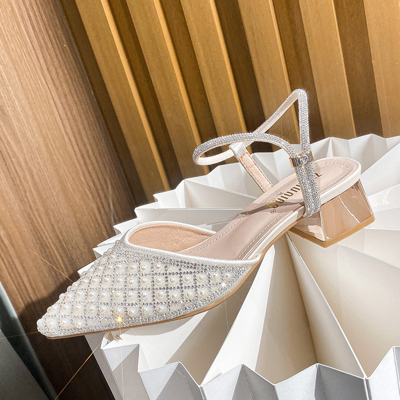 仙女风中跟百搭尖头水钻一字带后空单鞋 包头粗跟凉鞋 女2025夏新款