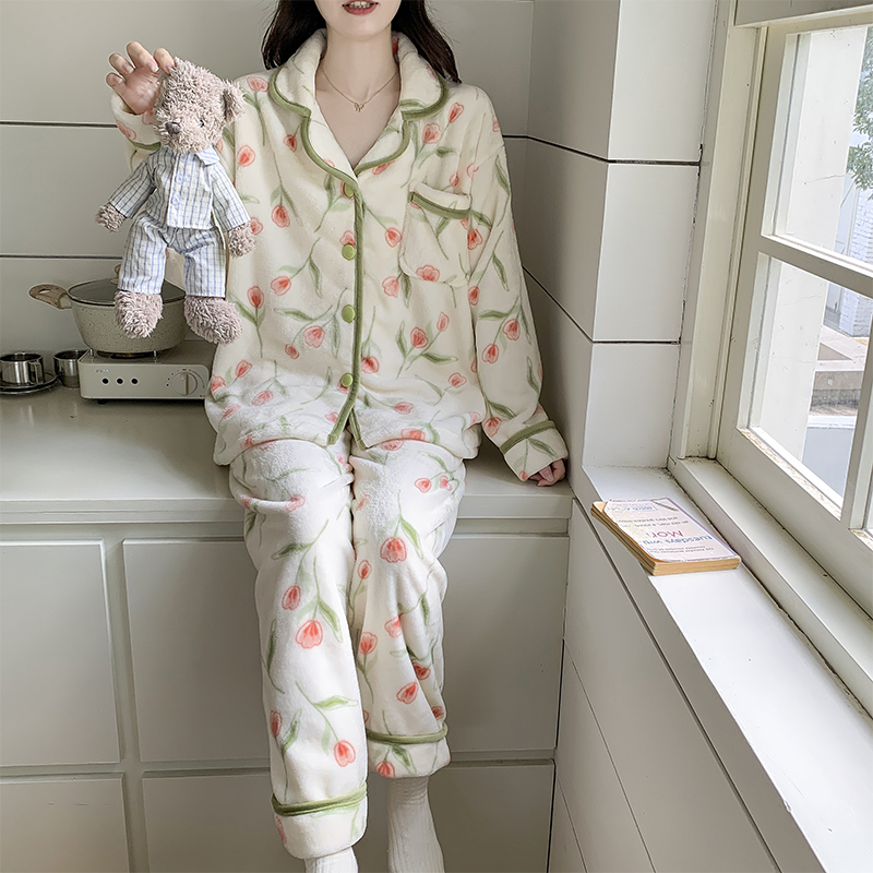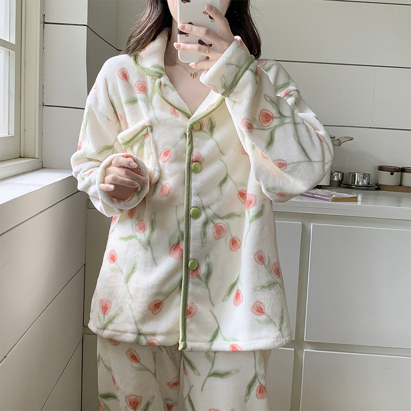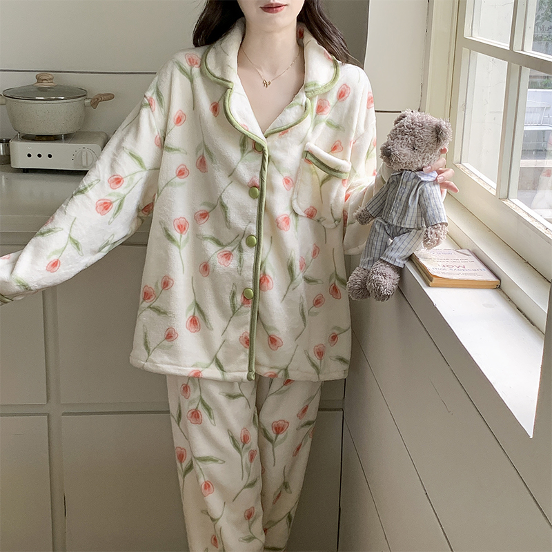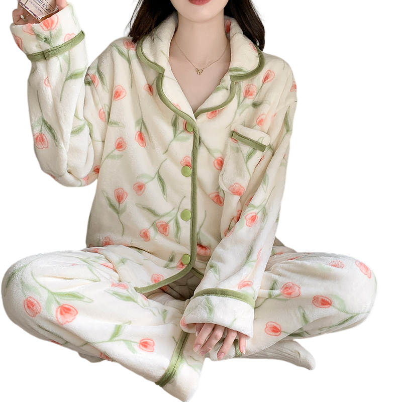 甜美花蕊女士法兰绒加厚保暖家居服 2025新款 珊瑚绒睡衣女款 秋冬季