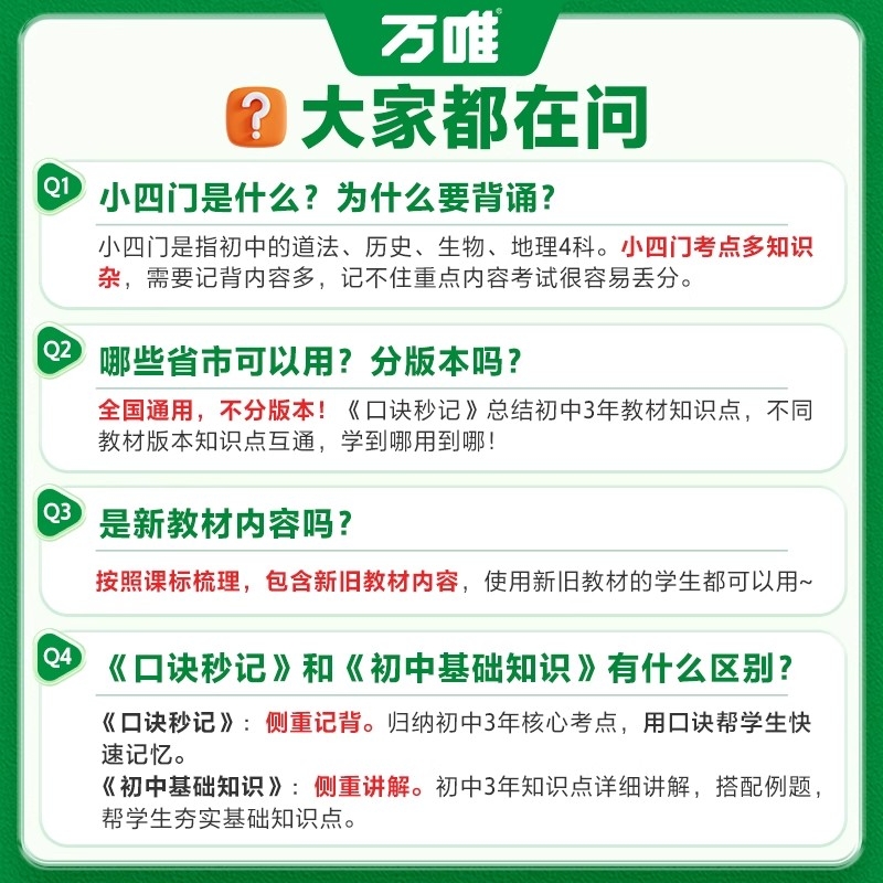 2026万唯中考口诀秒记初中小四门必背知识点速记人教版 初一二必刷题七八年级政治历史生物地理基础知识手册中考总复习辅导资料