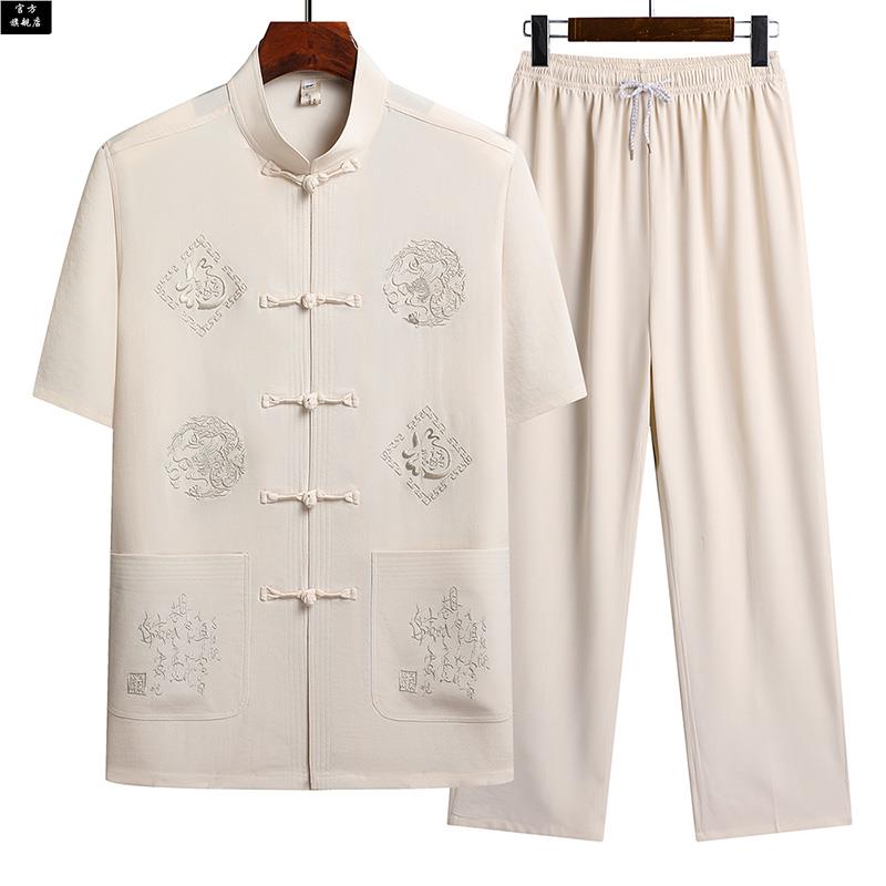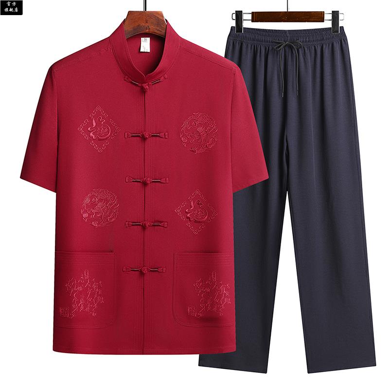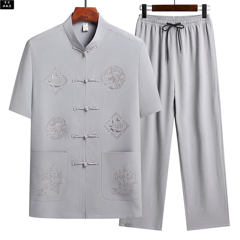 男冰丝薄款 中老年唐装 短袖 套装 汉服 保罗官方夏季 中国风爸爸装 新款