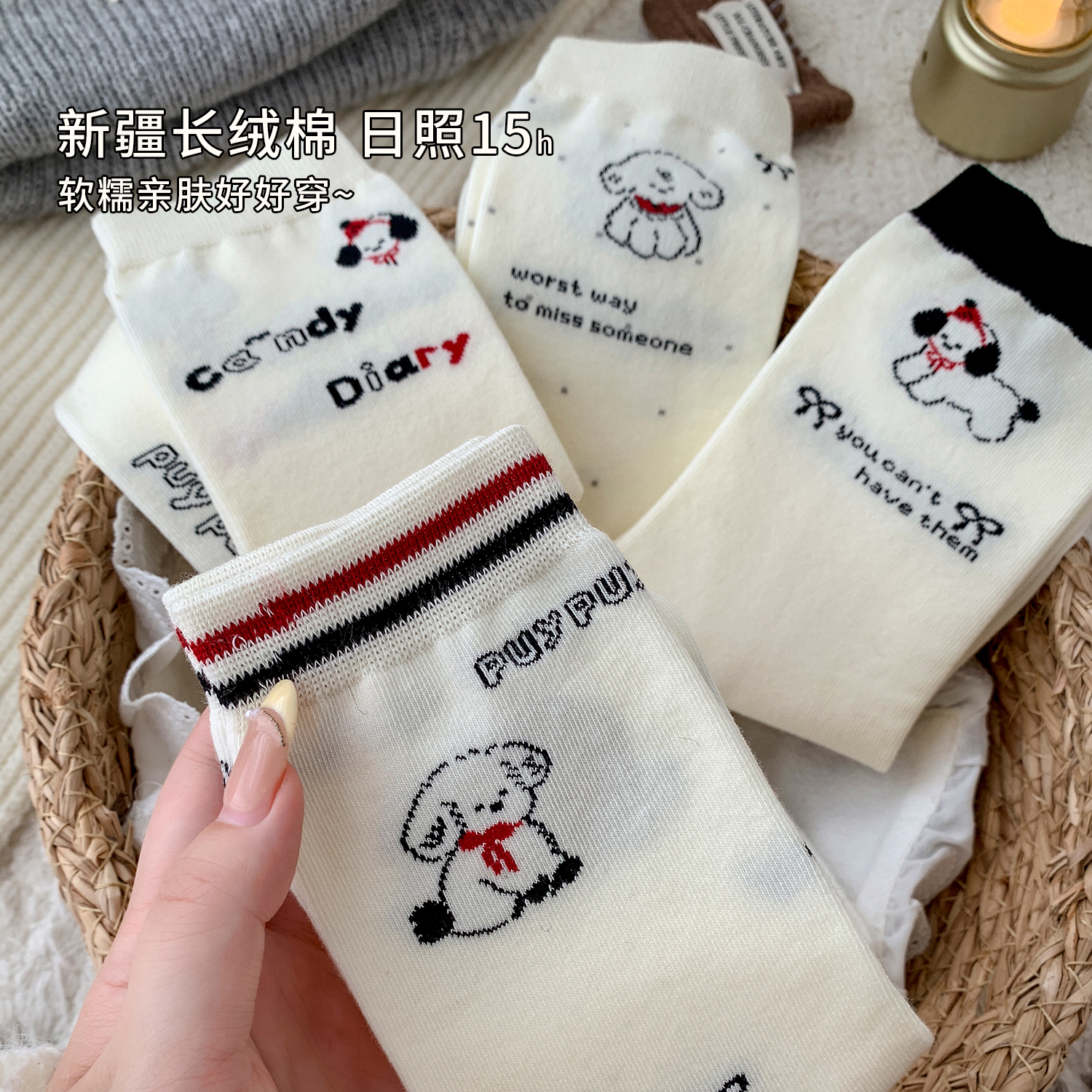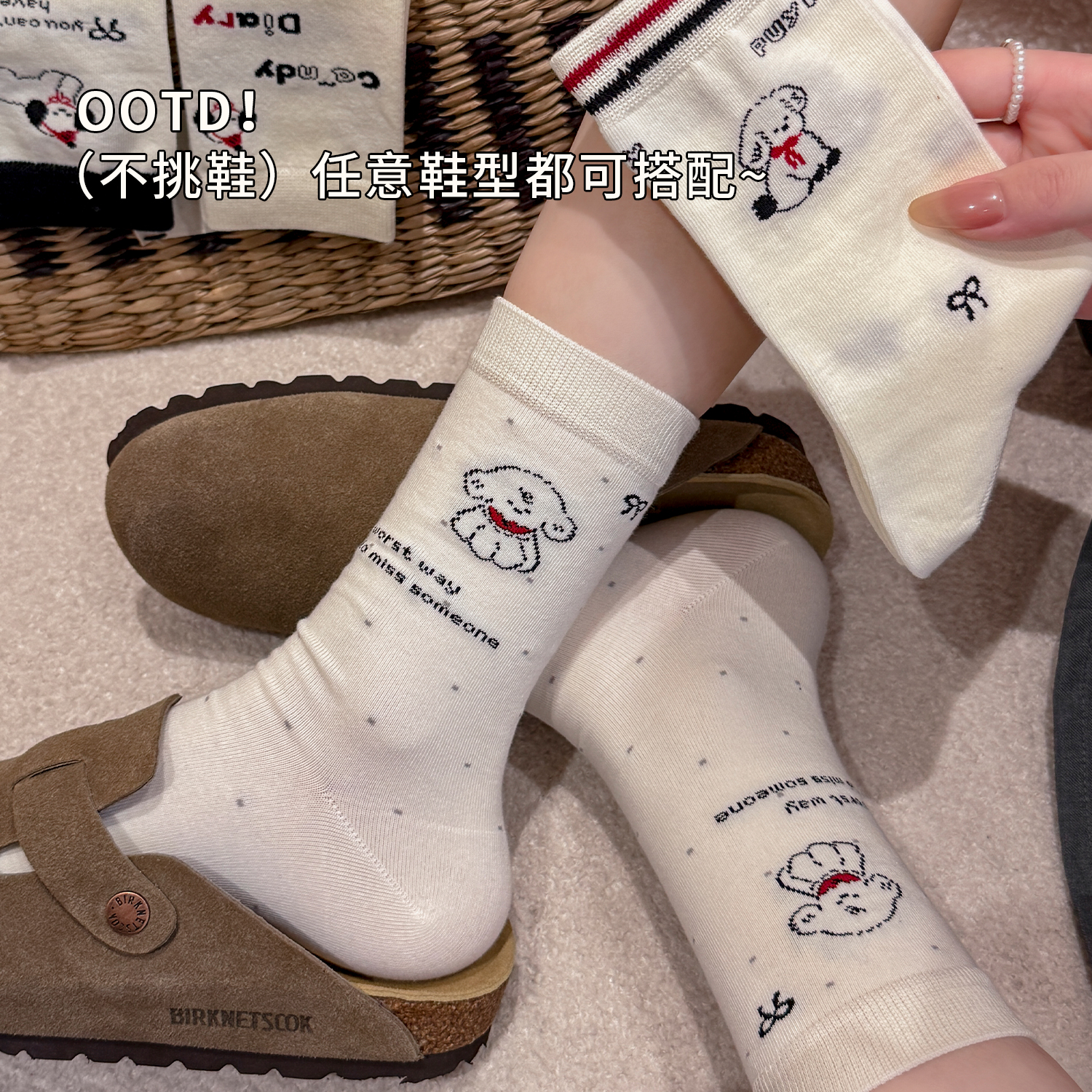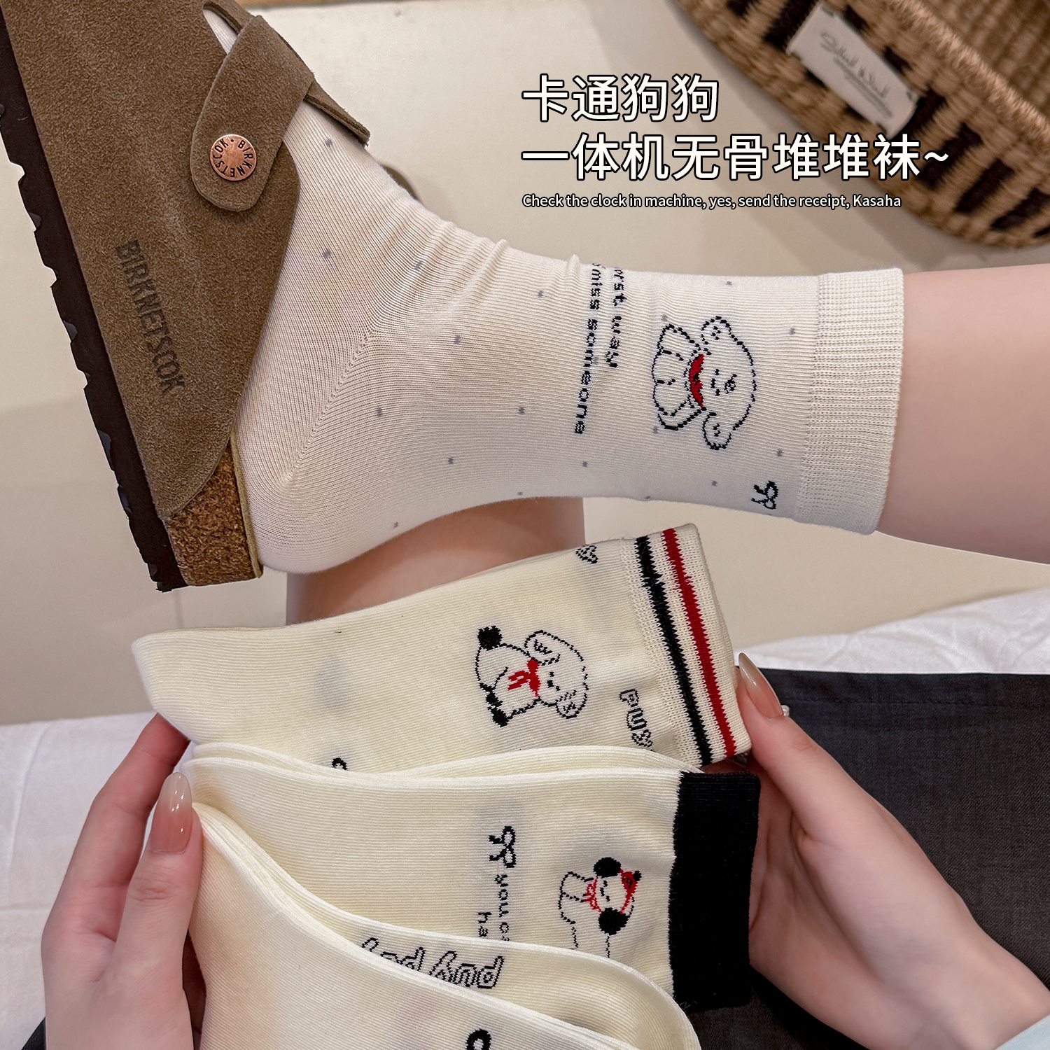 袜子女中筒袜纯棉春秋可爱卡通无骨袜白色秋天堆堆长筒袜配勃肯鞋