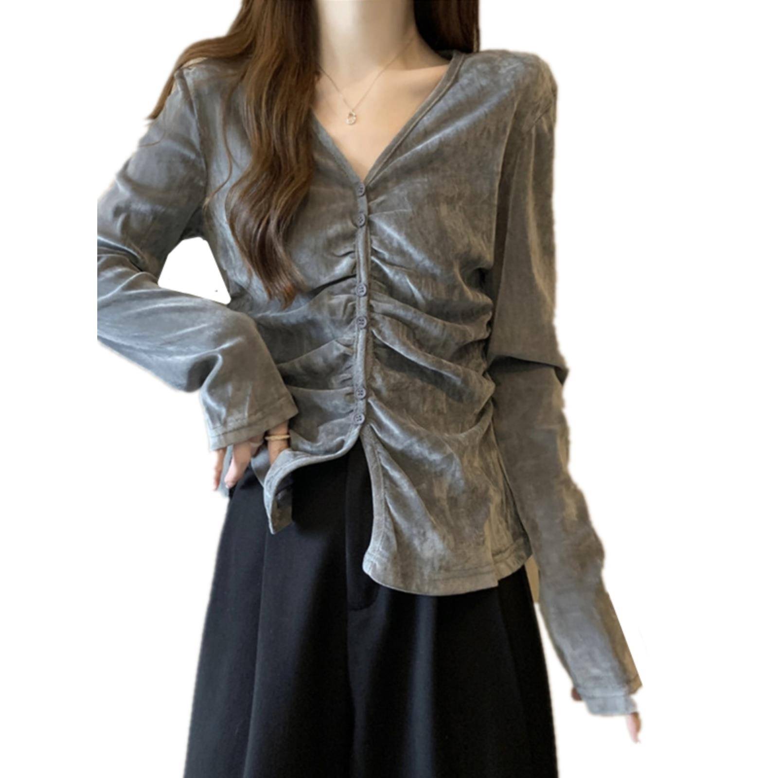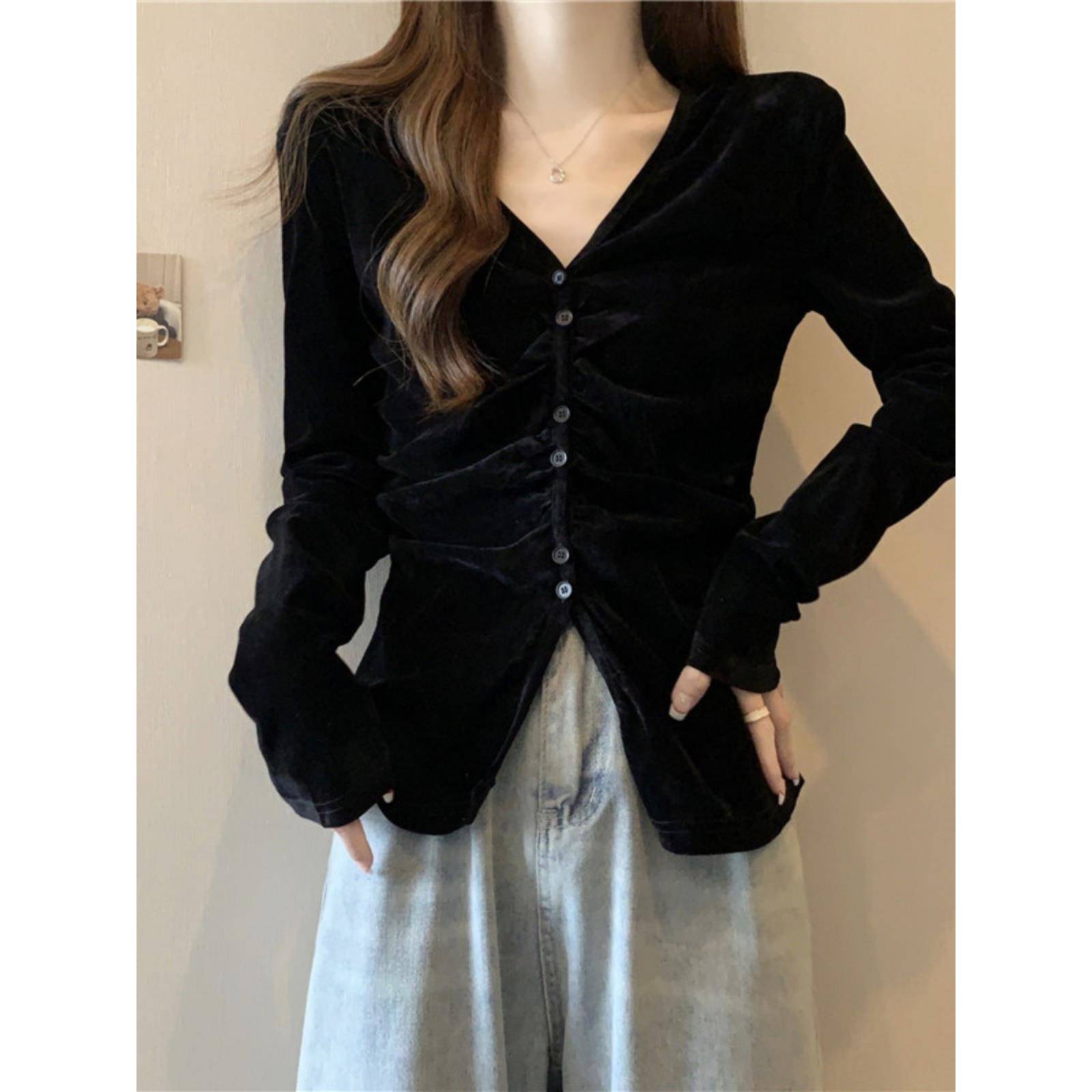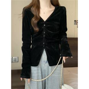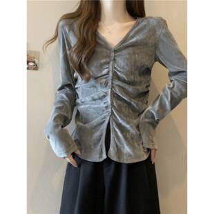 褶皱收腰不规则打底1012z V领正肩上衣女大码 秋冬金丝绒长袖 T恤衫