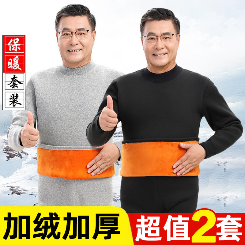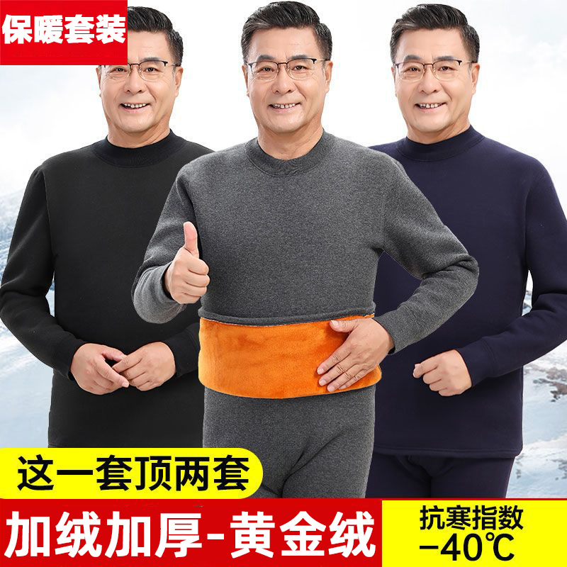老人御寒秋衣秋裤 加绒加厚纯色爸爸冬装 保暖内衣套装 中老年男士
