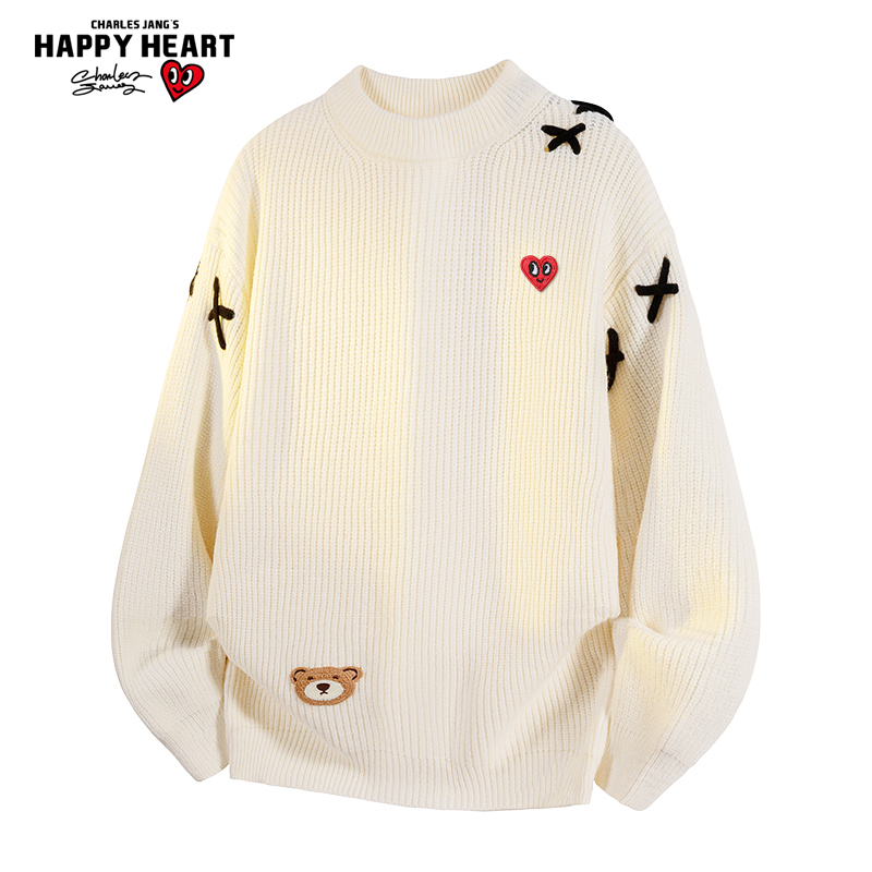 慵懒风休闲针织衫 小熊刺绣圆领毛衣男秋冬季 情侣 美式 查尔斯桃心