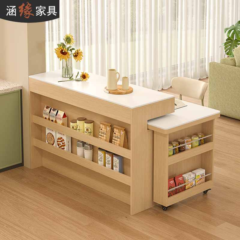 可伸缩岛台餐桌一体原木奶油风岩板吧台餐边柜旋转多功能饭桌E84