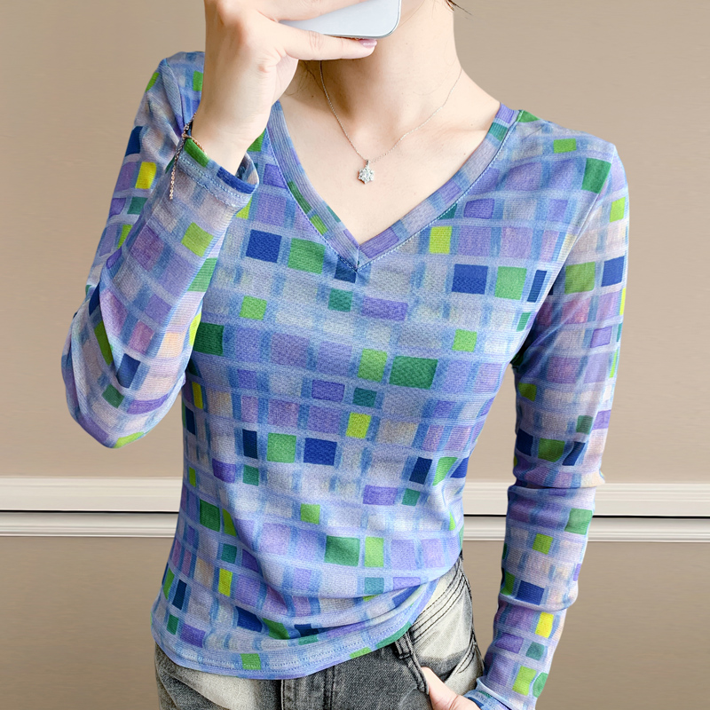 格子印花长袖 女秋冬新款 T恤减龄显瘦上衣潮 欧货V领网纱打底衫 时尚