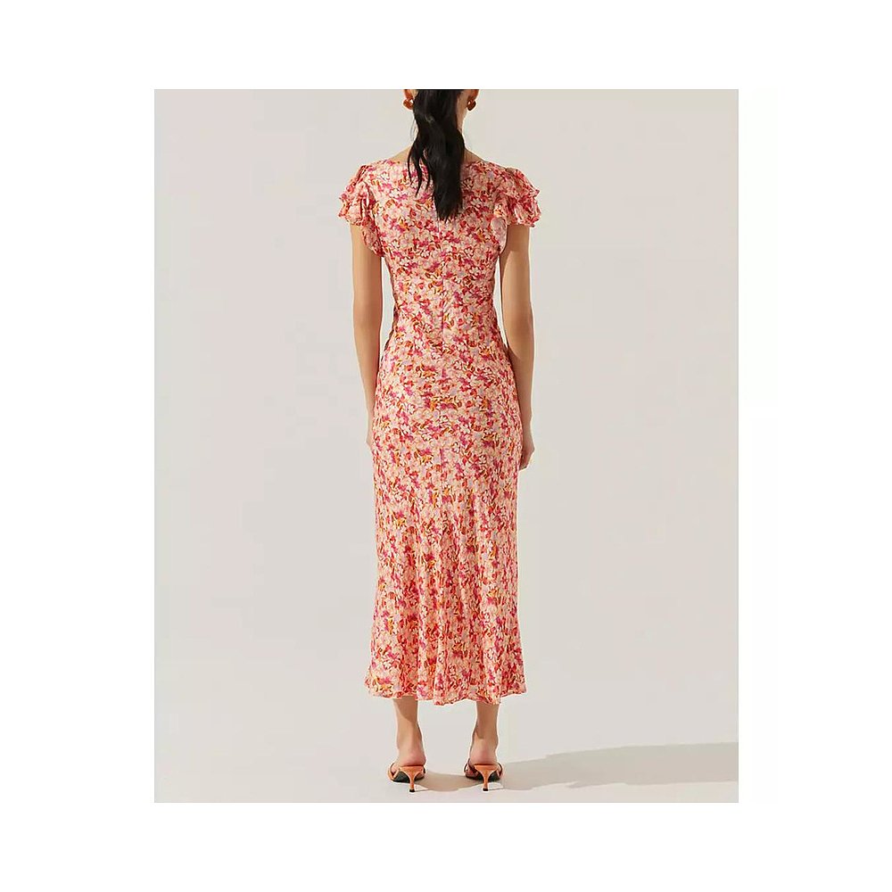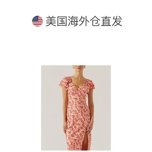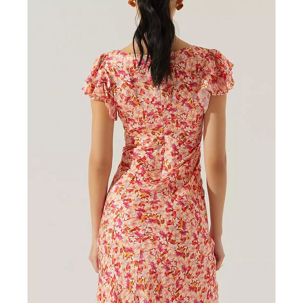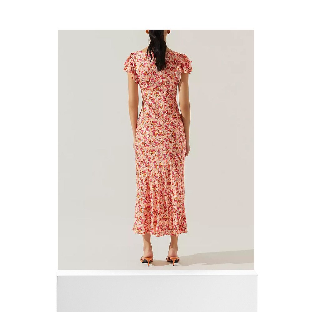 BCBG25早秋新款 流行设计感花卉印花花边褶皱立领系带女连衣裙 时尚