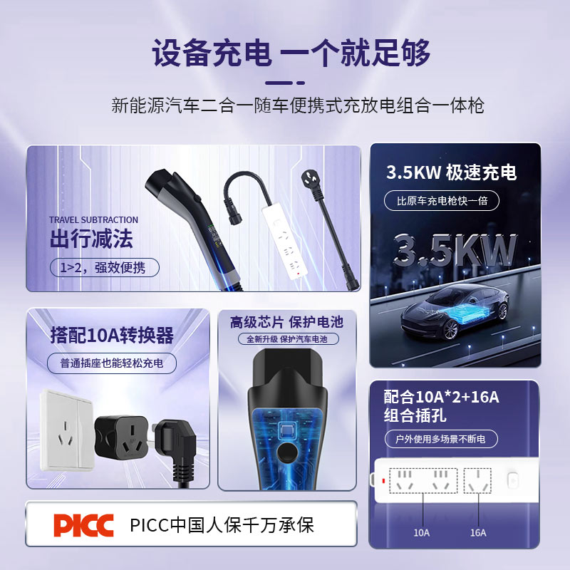 吉利星愿随车充电枪新能源汽车家用便携式 慢充口充放电一体枪通用