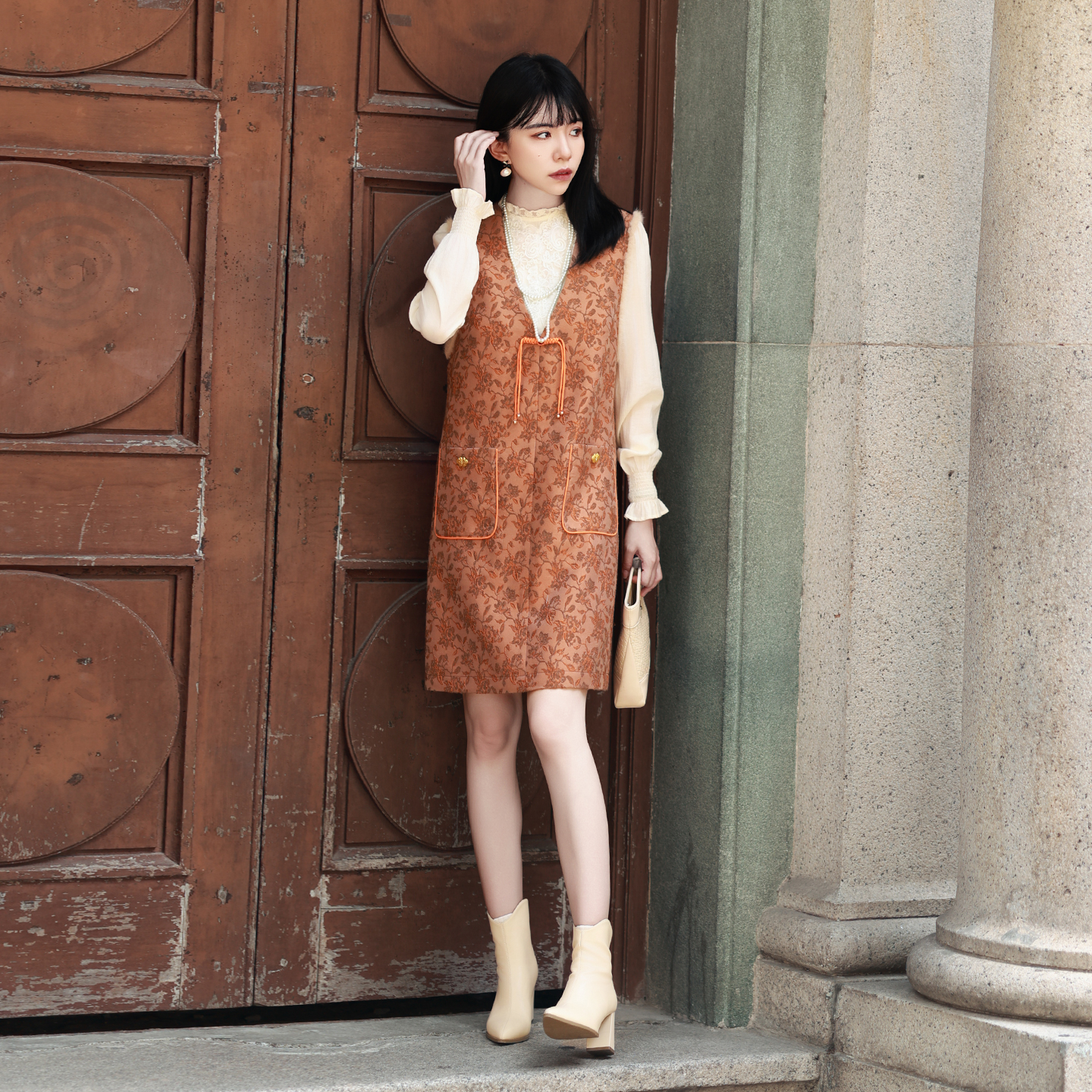 五丁目衣舍2025新款 套头A字裙69902060 复古V领印花连衣裙女无袖