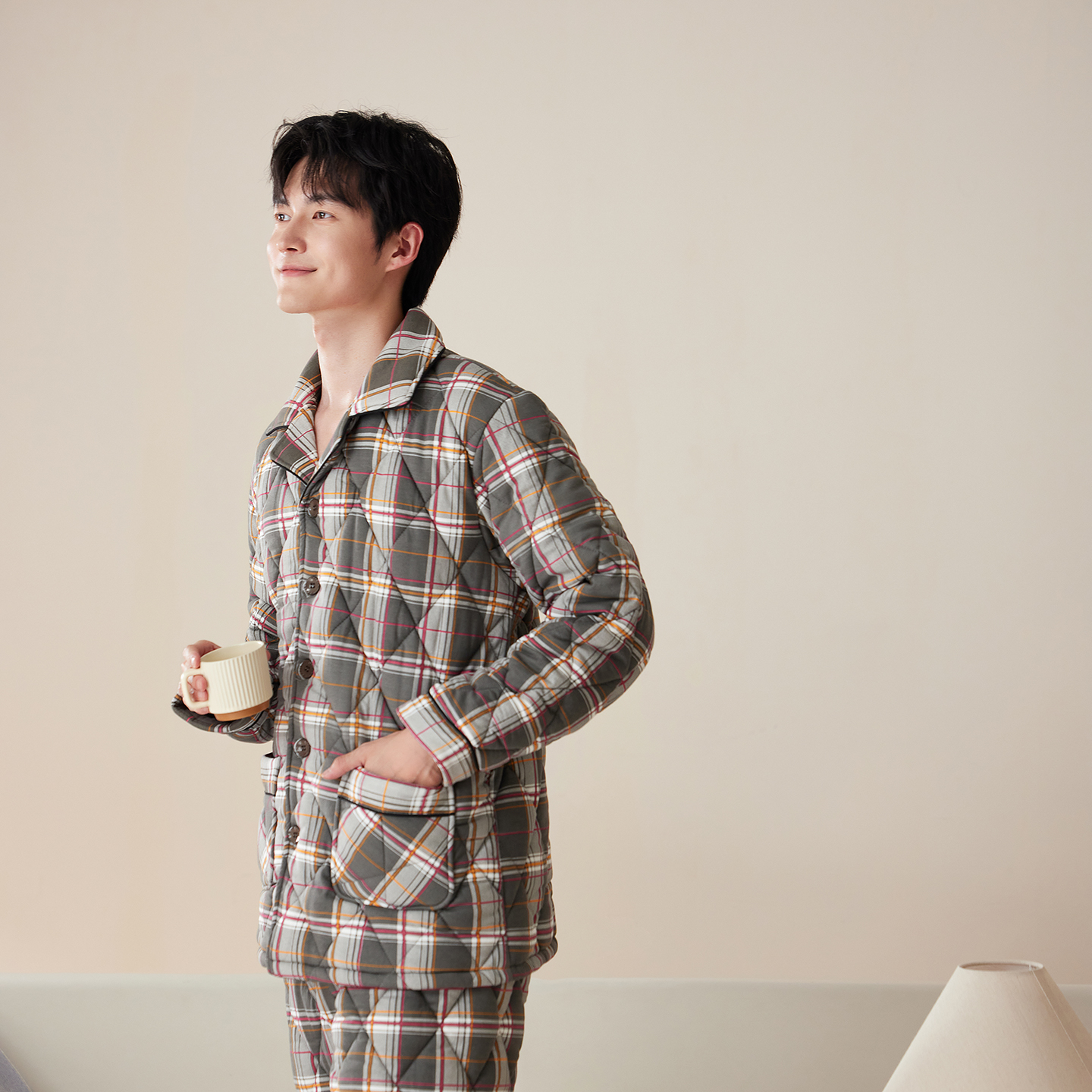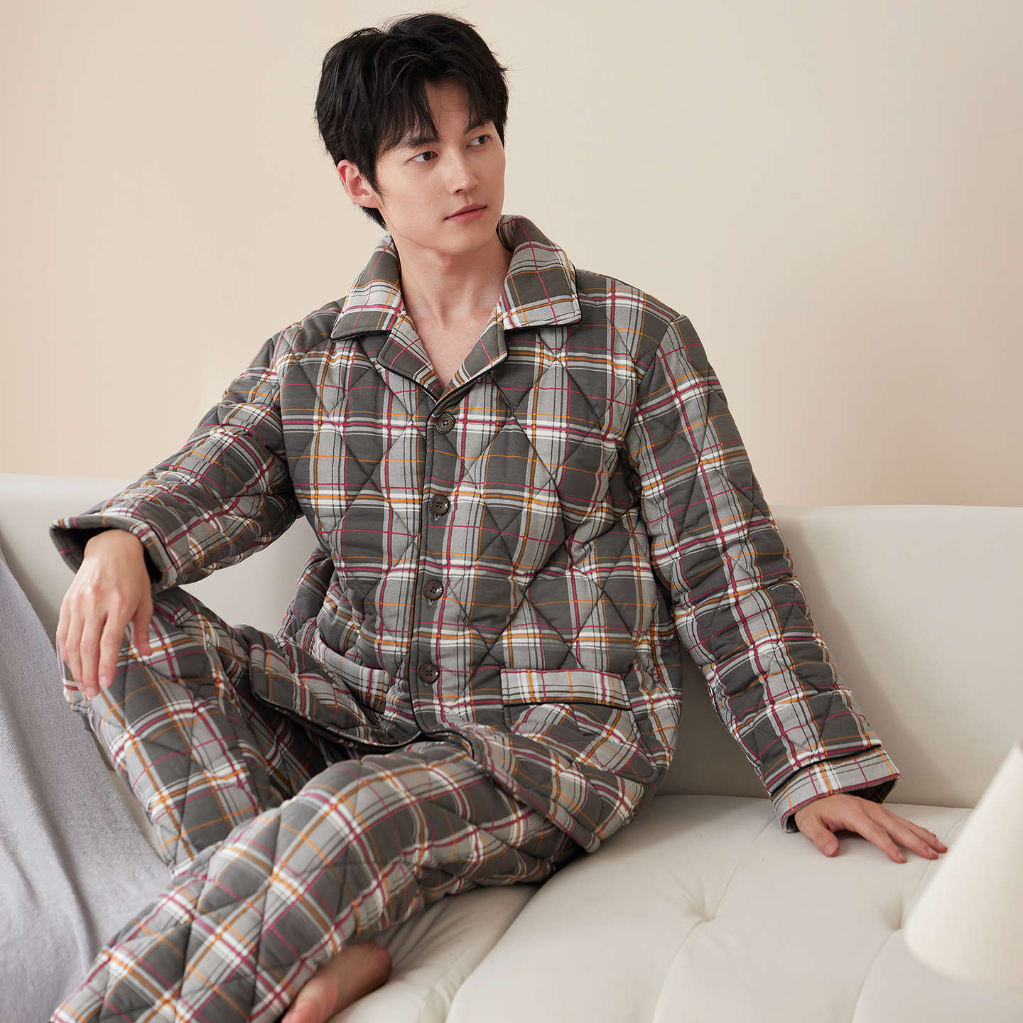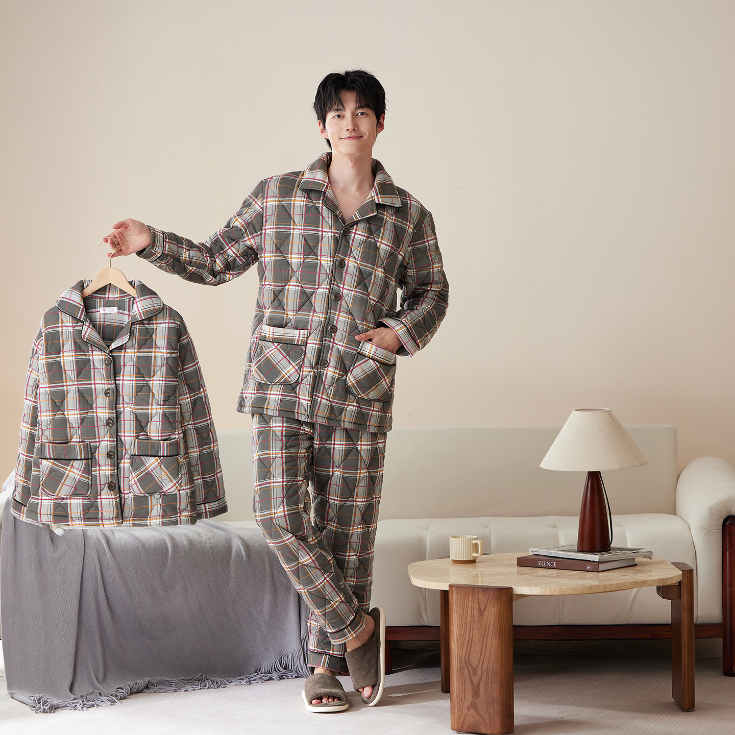 防寒棉袄格纹外穿家居服套装 男士 夹棉睡衣三层加厚纯棉防静电冬款
