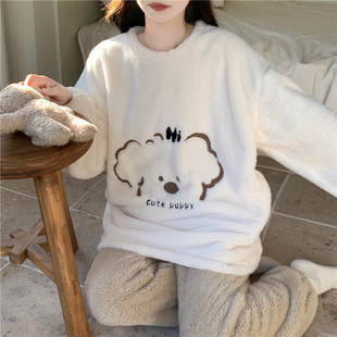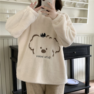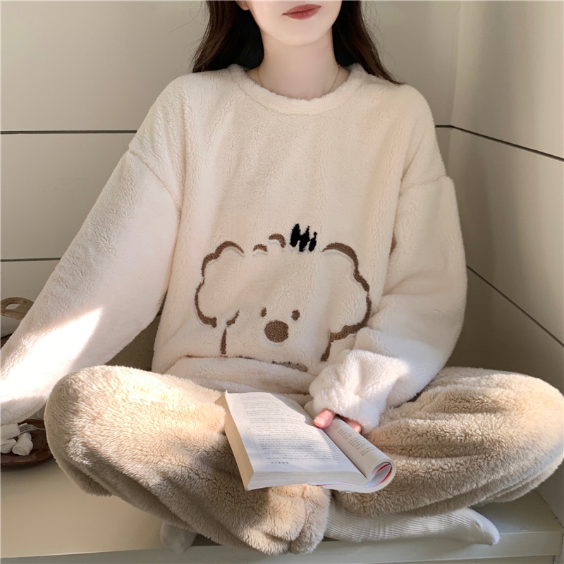家居服 宽松加厚长毛绒冬天圆领套装 秋冬季 珊瑚绒睡衣女卡通熊大码