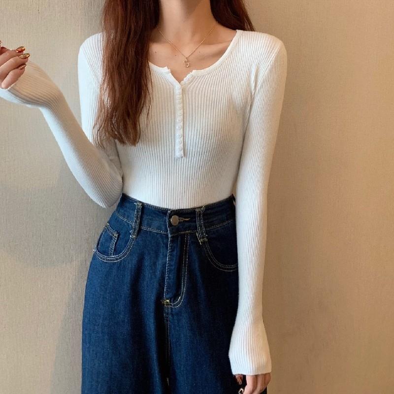 显瘦高级感 修身 现货洋气独特别致甜辣排扣V领针织打底衫 秋冬新款