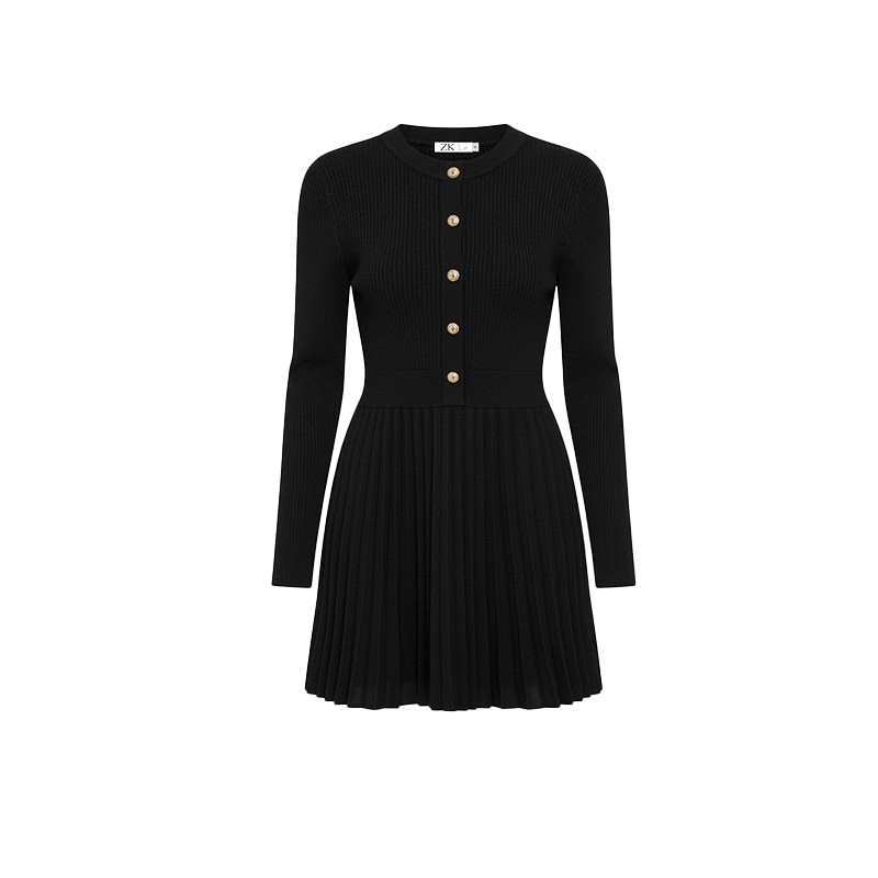 收腰设计感A字百褶裙子 针织连衣裙女新款 赫本风气质圆领修身 长袖