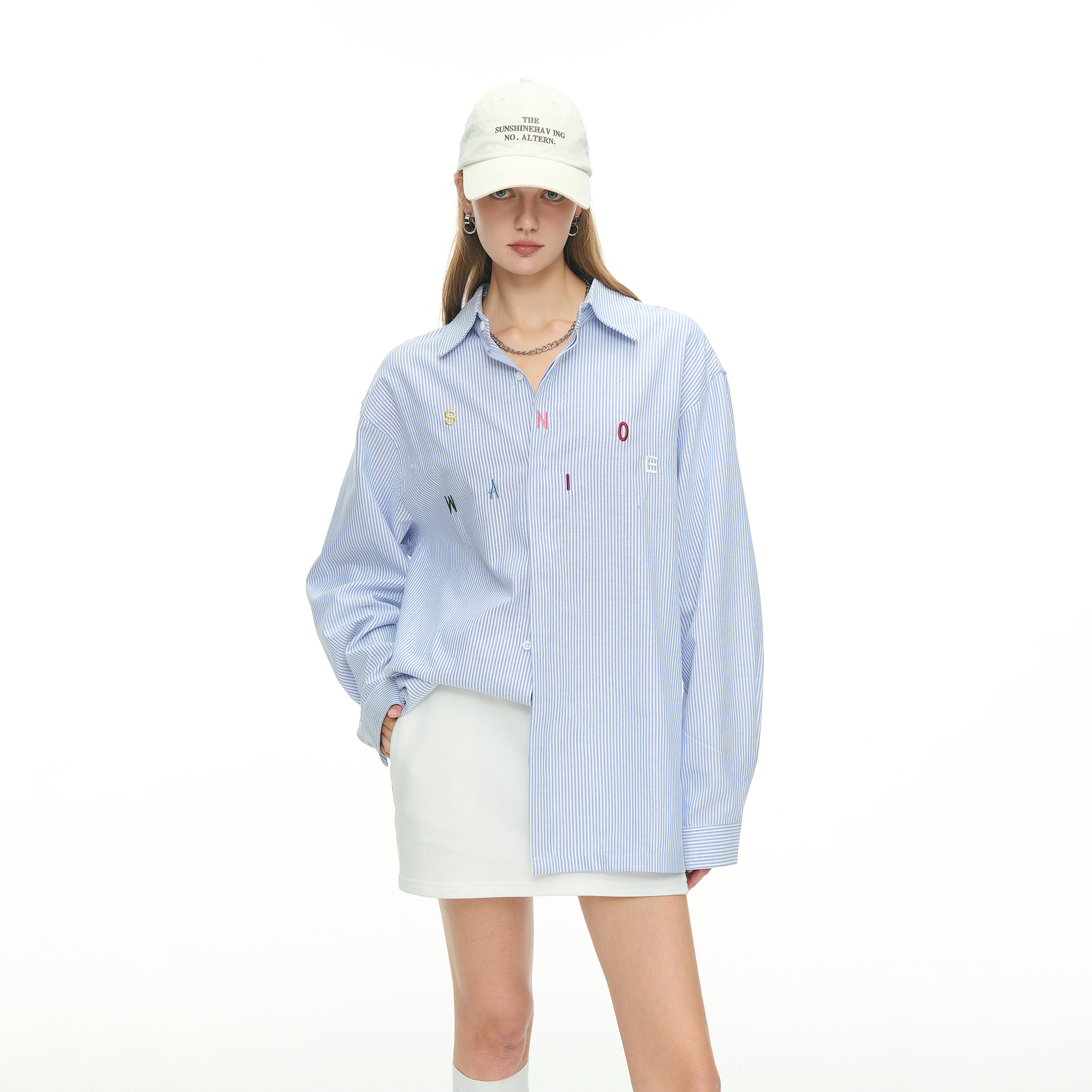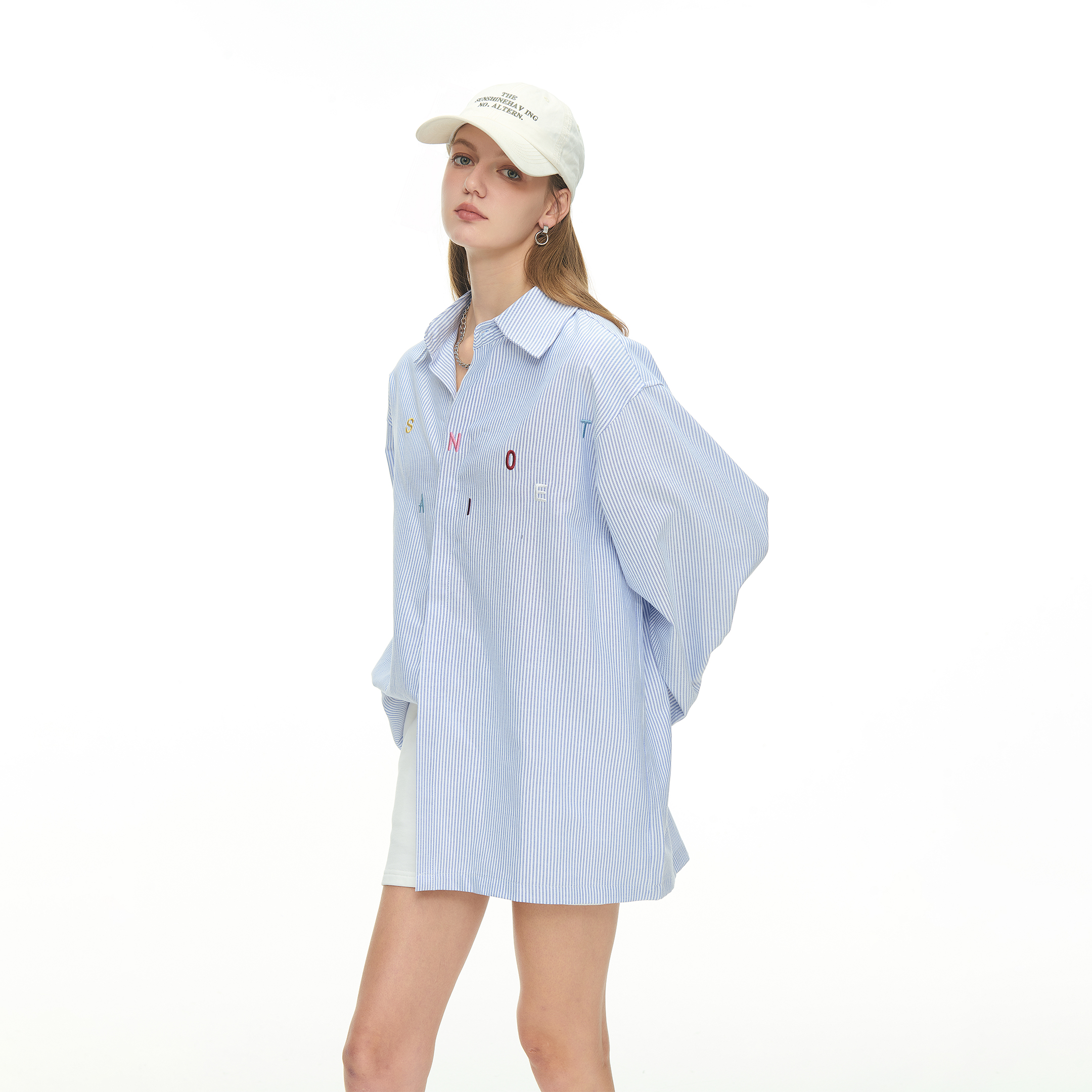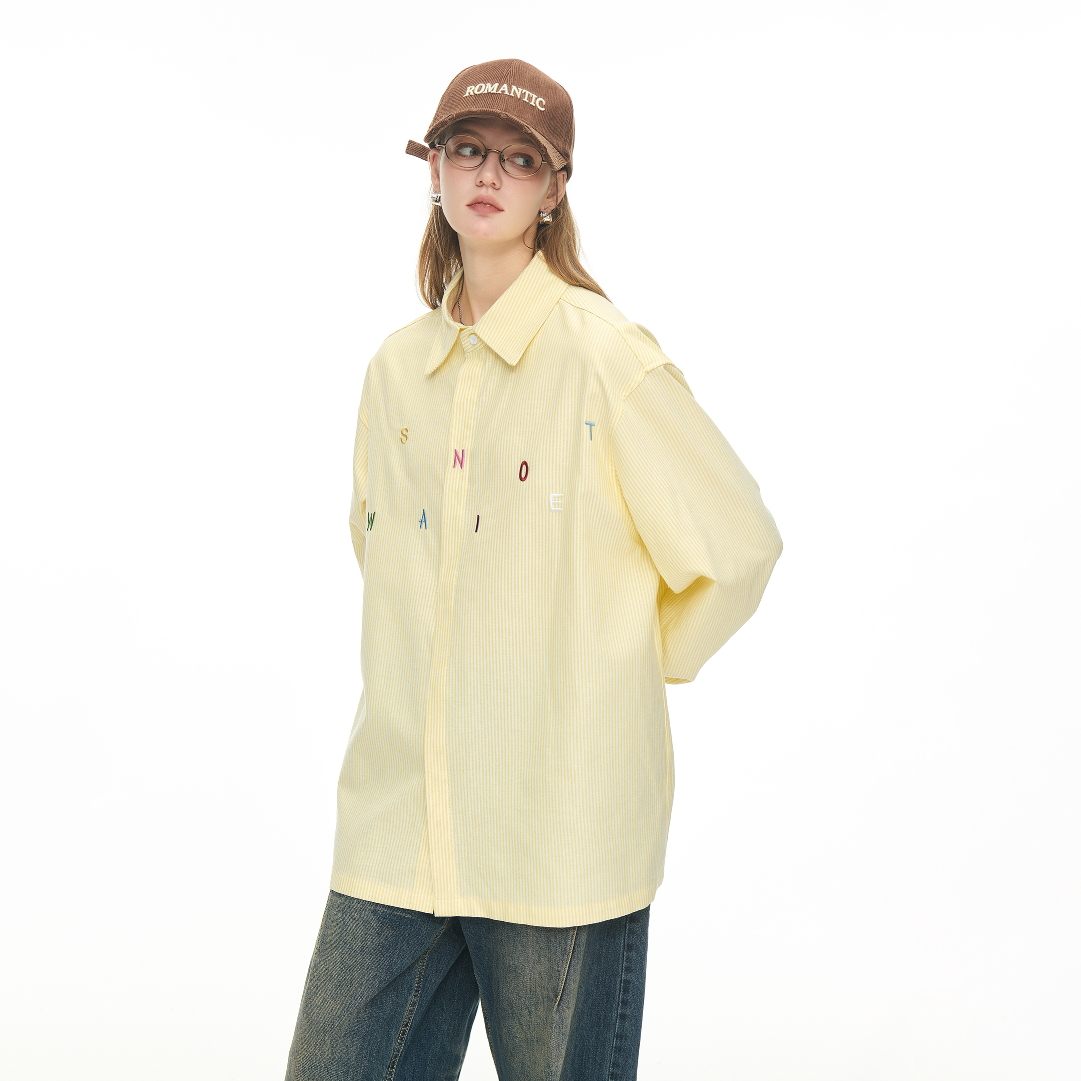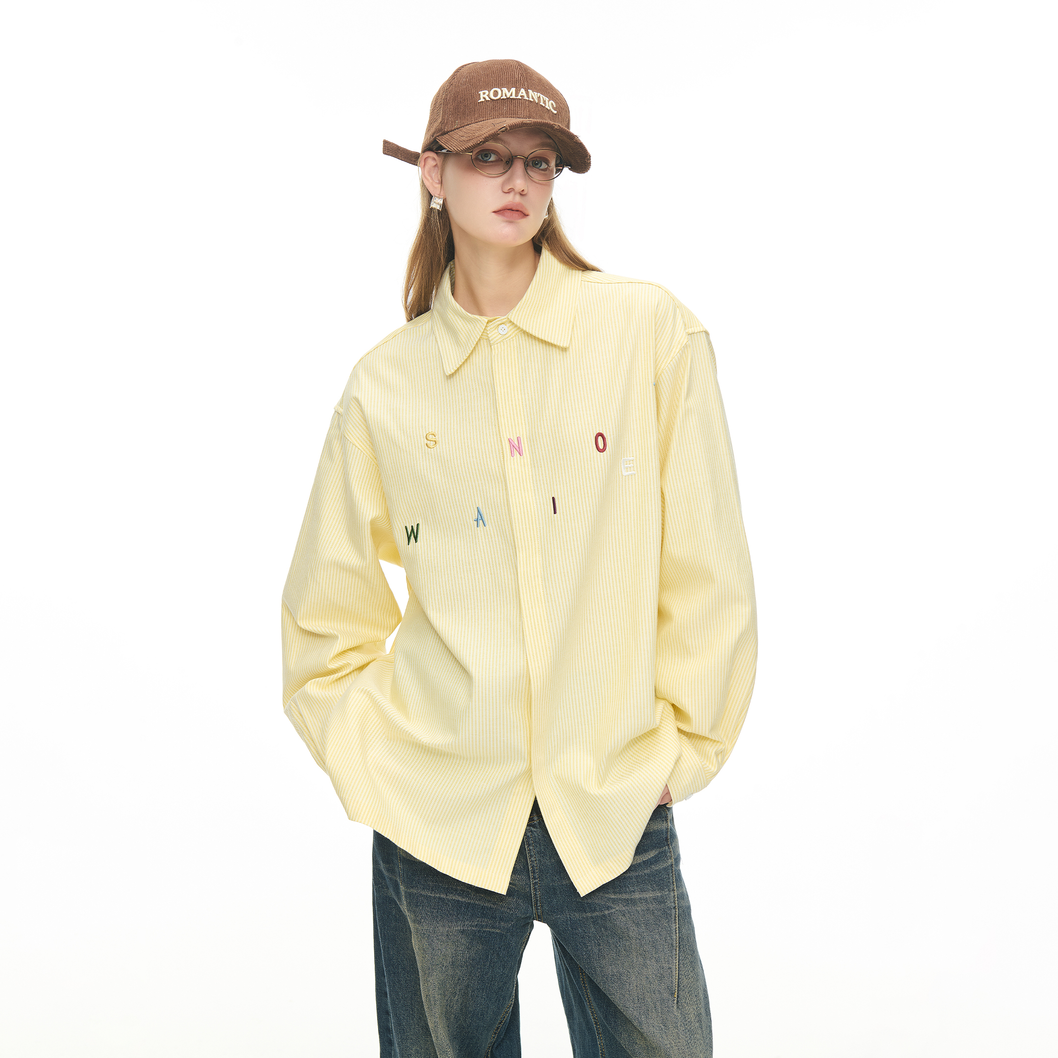 复古字母刺绣条纹衬衫 长袖 女秋季 宽松休闲百搭情侣款 衬衣 新款 美式