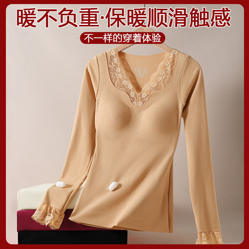 蕾丝保暖内衣套装 女带胸垫免穿文胸红色本命年秋冬德绒加厚打底衫