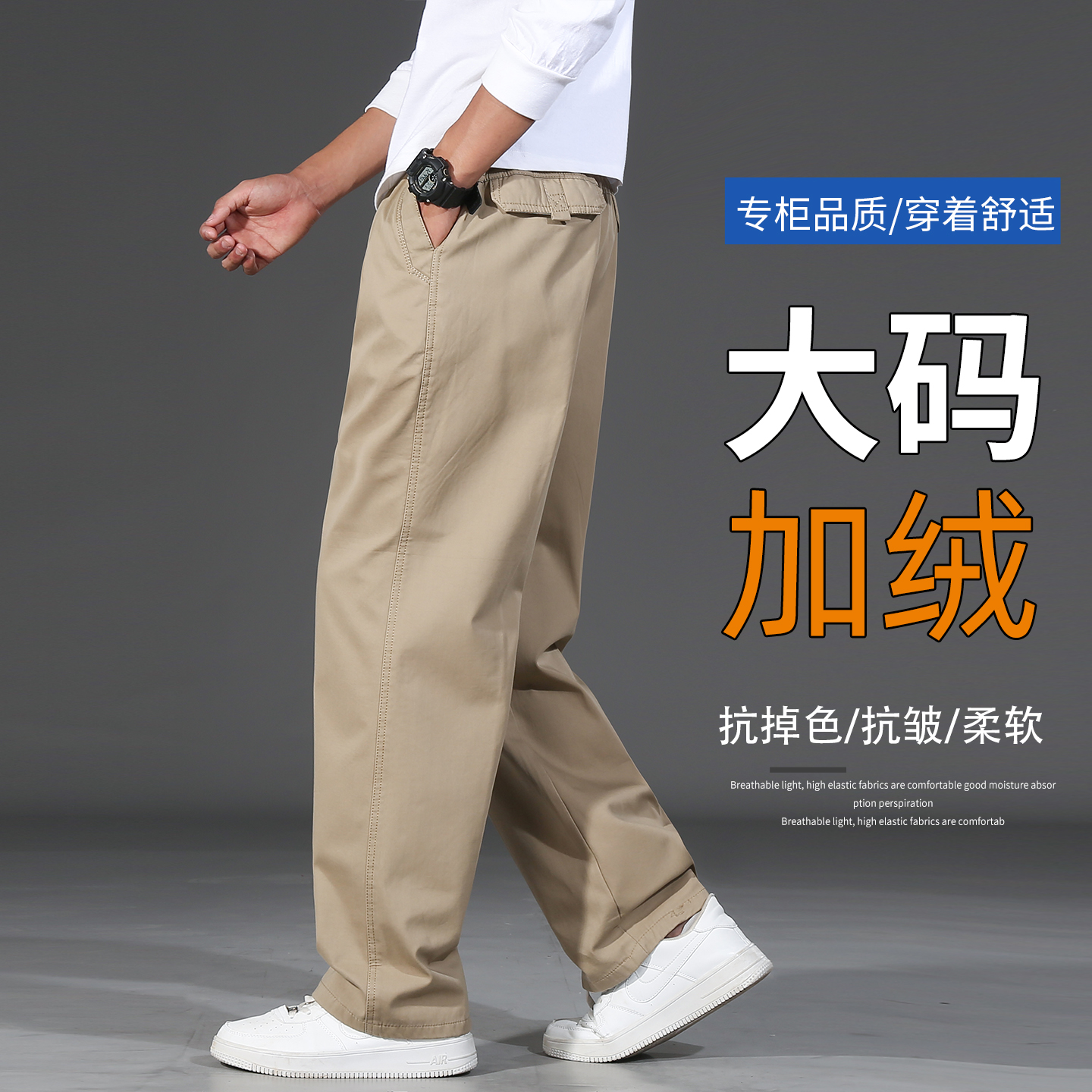 中年爸爸高腰保暖宽松裤 裤 松紧腰 男浅灰色加绒加厚纯棉工装 休闲裤