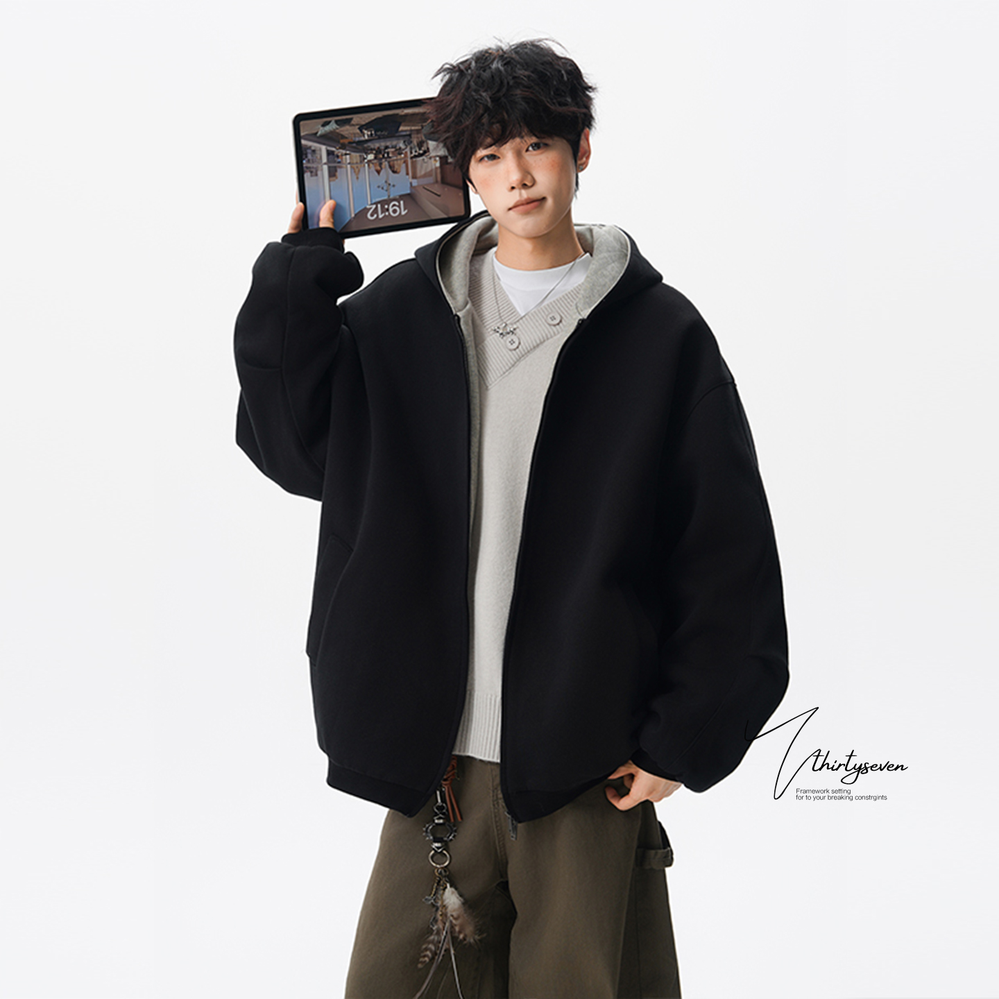 宽松休闲外套撞色情侣开衫 V37美式 潮牌重磅双拉链连帽卫衣男秋季