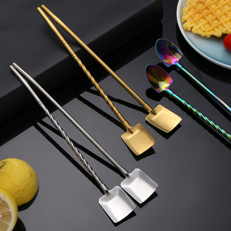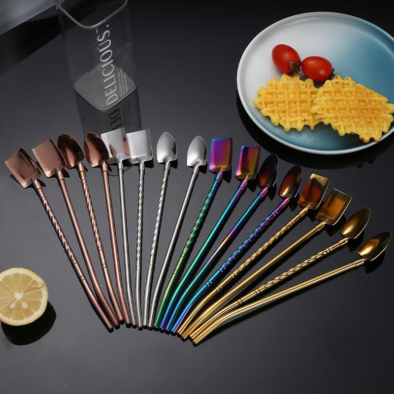 304不锈钢网红铁锹铲子吸管勺子一体两用搅拌勺西瓜冰淇淋勺