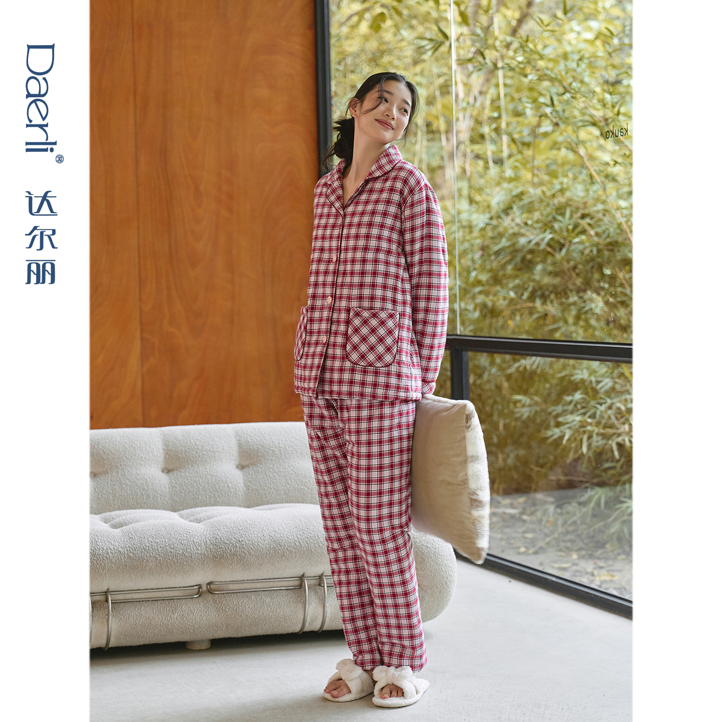 格子秋冬家居服套装 达尔丽三层夹棉加厚睡衣女冬季 纯棉空气棉长袖