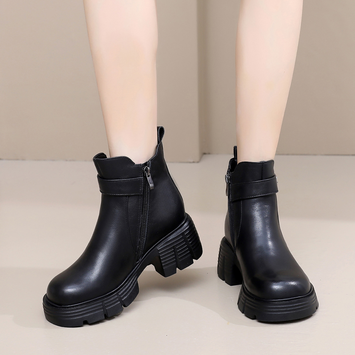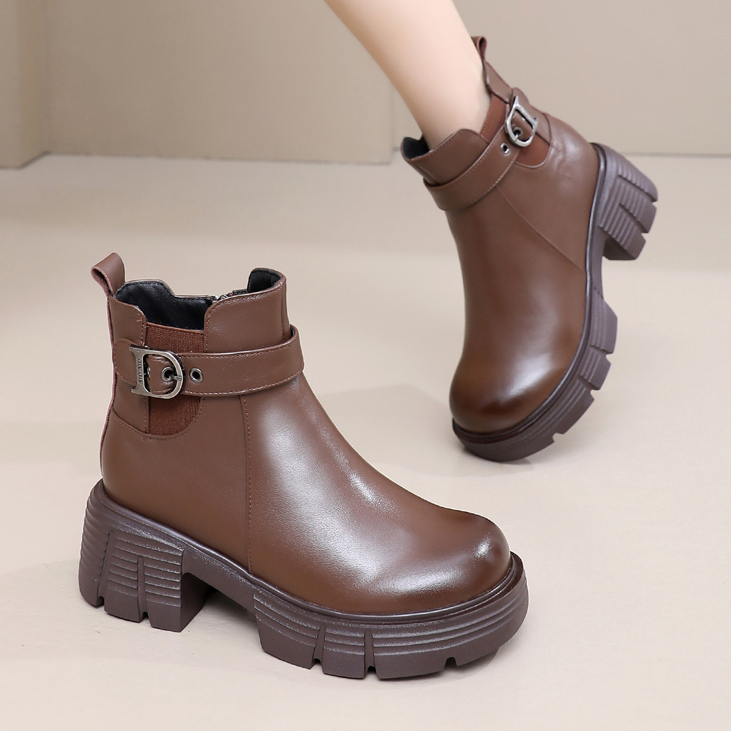 棉鞋 秋冬季 真皮厚底马丁靴女粗跟短靴舒适轻便防滑靴子加绒妈妈鞋