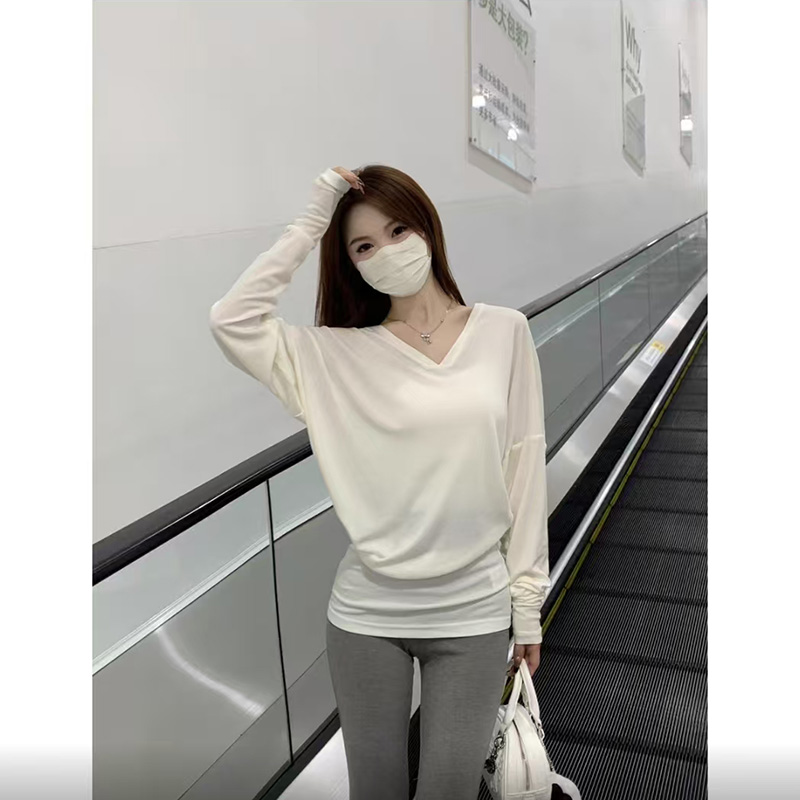 v领长袖 黑色显瘦蝙蝠袖 女装 女内搭大码 早秋chic别致上衣t恤 打底衫