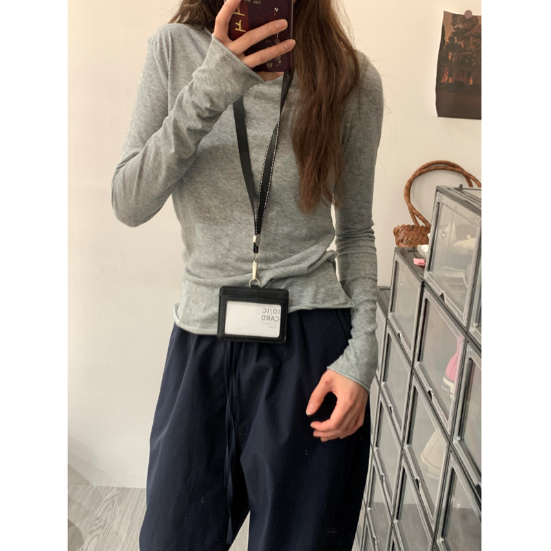 韩系chic别致小上衣 内搭打底衫 设计感卷边纯色正肩长袖 t恤女秋季