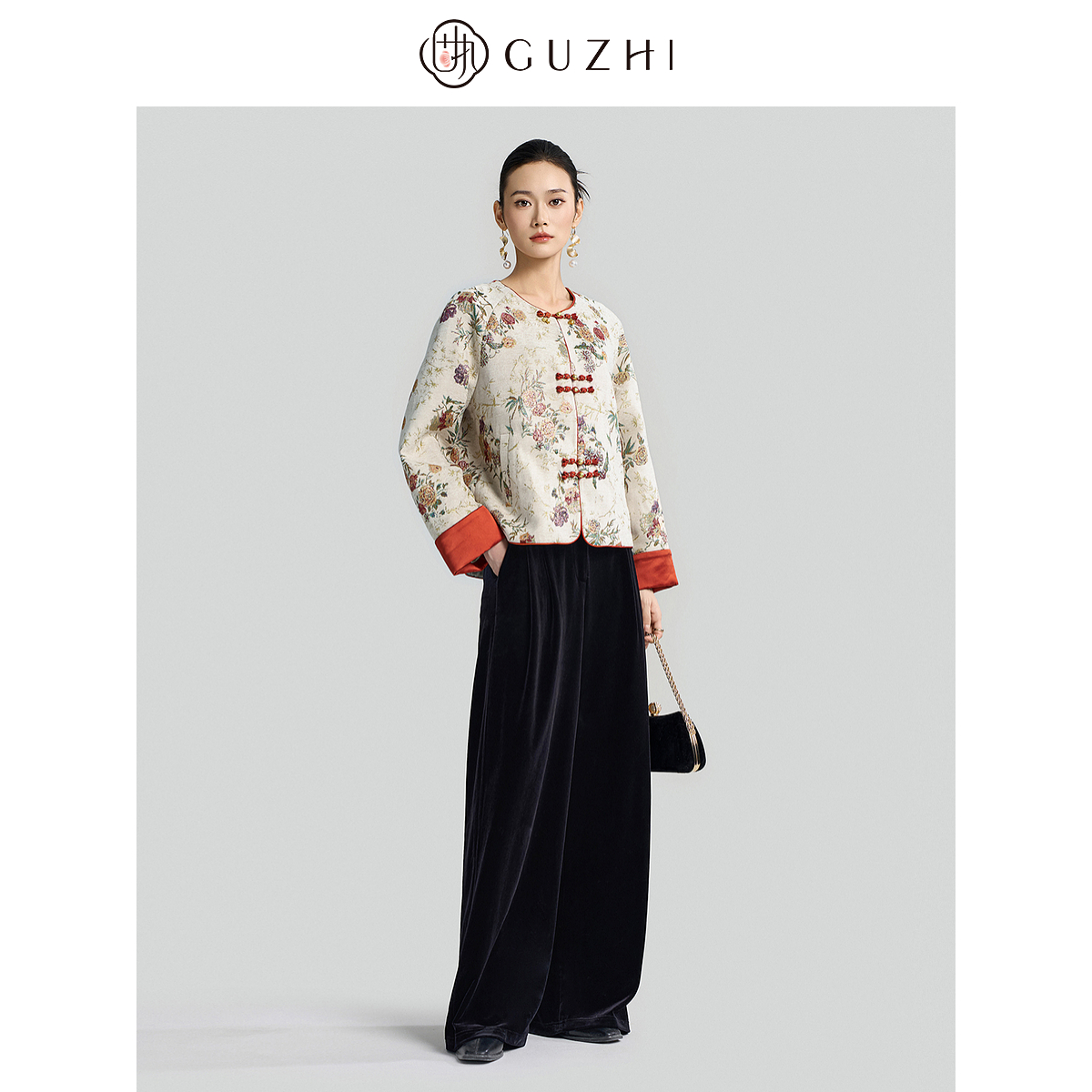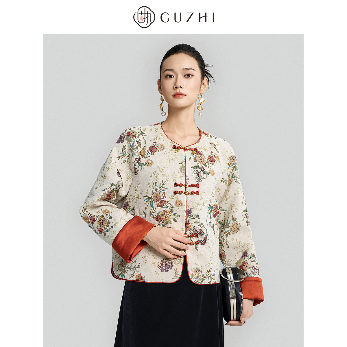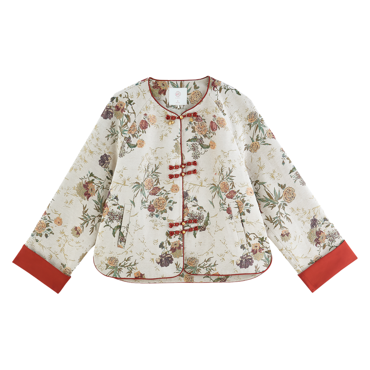 气质重工提花短款 圆领盘扣撞色长袖 外套 新中式 固执2025秋冬新款