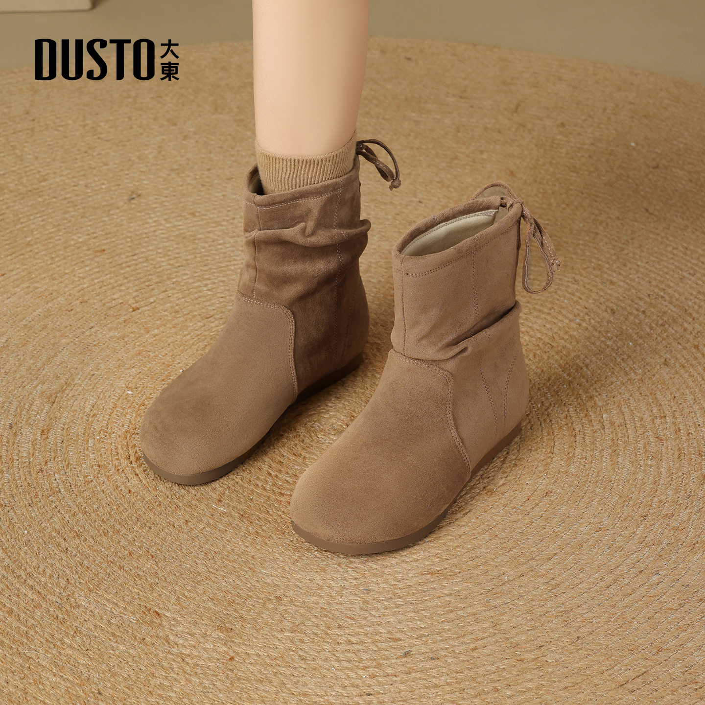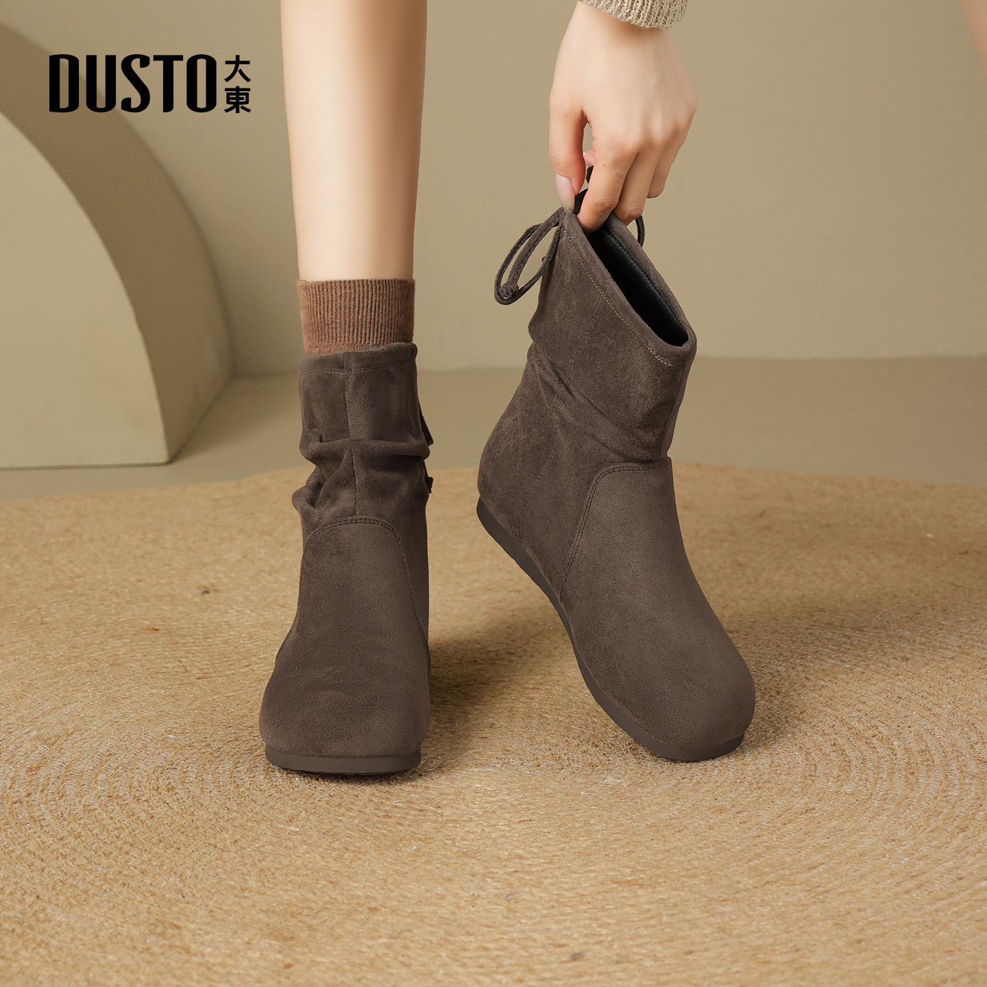 新款 2025年冬季 复古内增高中跟圆头平底黑色堆堆靴 靴女鞋 大东时装